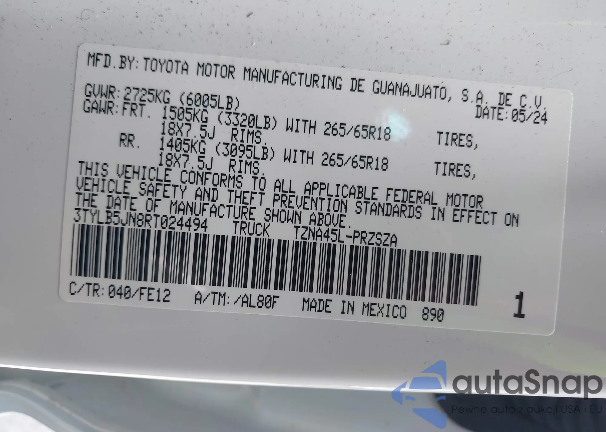 Samochód Toyota Tacoma 2024 (VIN 3TYLB5JN8RT024494) ma dokumenty uniemożliwiające rejestrację. Mogą pojawić się trudności przy eksporcie i rejestracji. Skontaktuj się z ekspertami AutaSnap w celu znalezienia alternatywy.