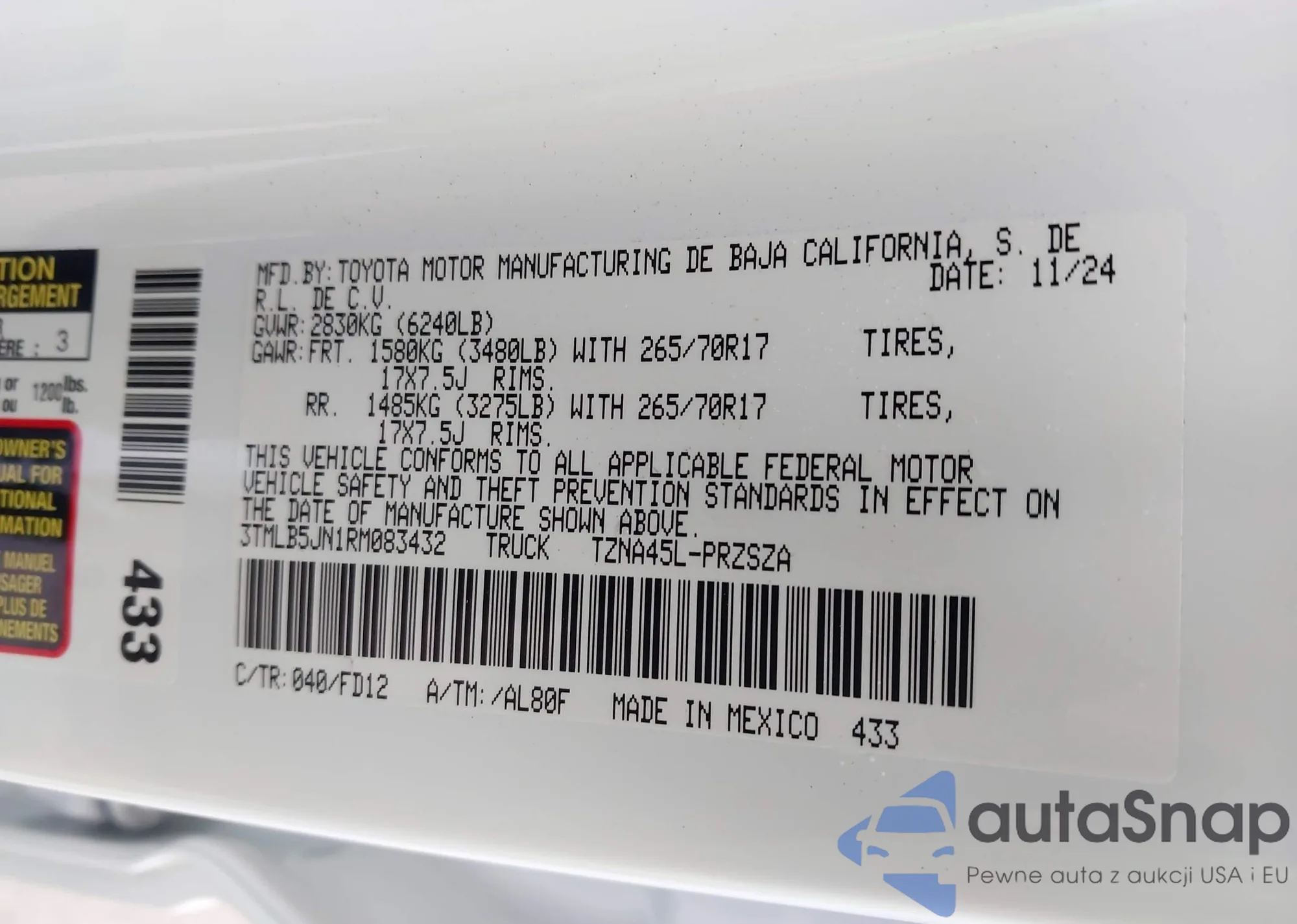 Samochód Toyota Tacoma 2024 (VIN 3TMLB5JN1RM083432) nie był wcześniej licytowany. Dokumenty są czyste, przebieg odpowiada lub jest niższy niż średnia rynku. Sprzedaje go firma ubezpieczeniowa – polecamy zakup. Dostawa do portu zajmie ok. 6–8 tygodni.