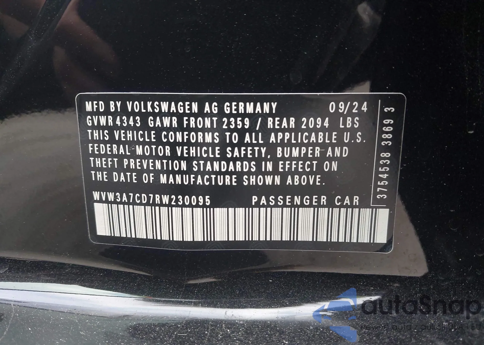 • VIN: WVW3A7CD7RW230095