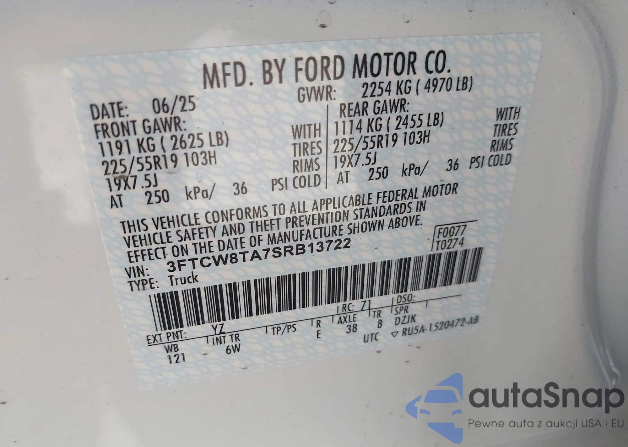 • VIN: 3FTCW8TA7SRB13722