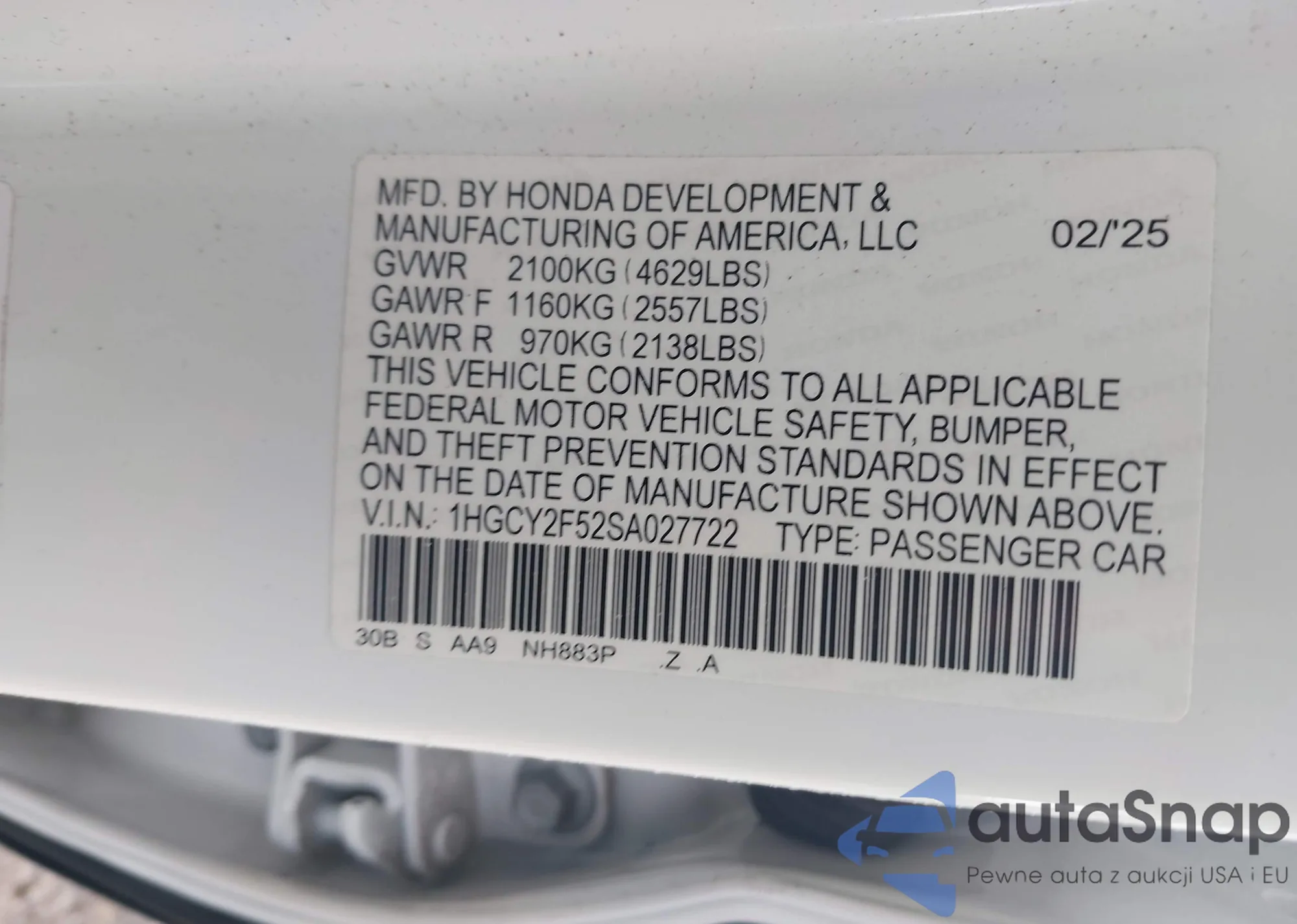 VIN: 1HGCY2F52SA027722