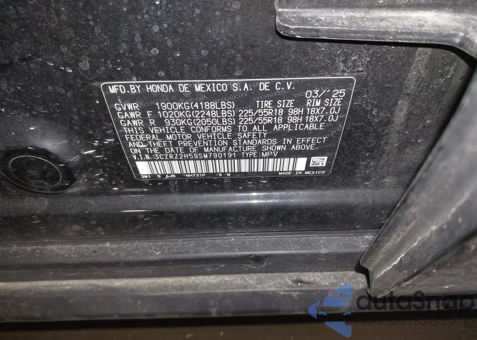 Samochód Honda HR-V 2025 (VIN 3CZRZ2H59SM790191) nie był wcześniej licytowany. Dokumenty są czyste, przebieg odpowiada lub jest niższy niż średnia rynku. Sprzedaje go firma ubezpieczeniowa – polecamy zakup. Dostawa do portu zajmie ok. 6–8 tygodni.
