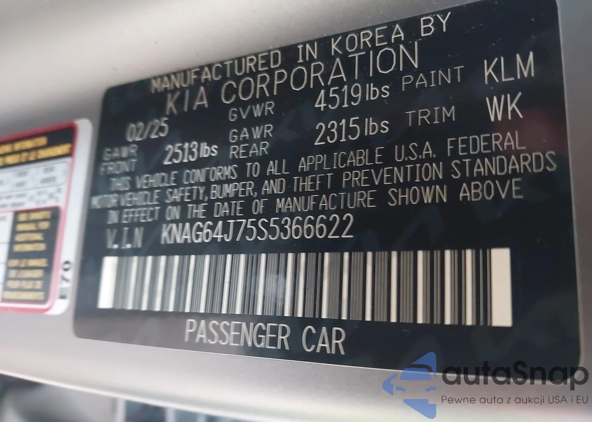 Samochód Kia K5 2025 (VIN KNAG64J75S5366622) nie był wcześniej licytowany. Dokumenty są czyste, przebieg odpowiada lub jest niższy niż średnia rynku. Sprzedaje go firma ubezpieczeniowa – polecamy zakup. Dostawa do portu zajmie ok. 6–8 tygodni.