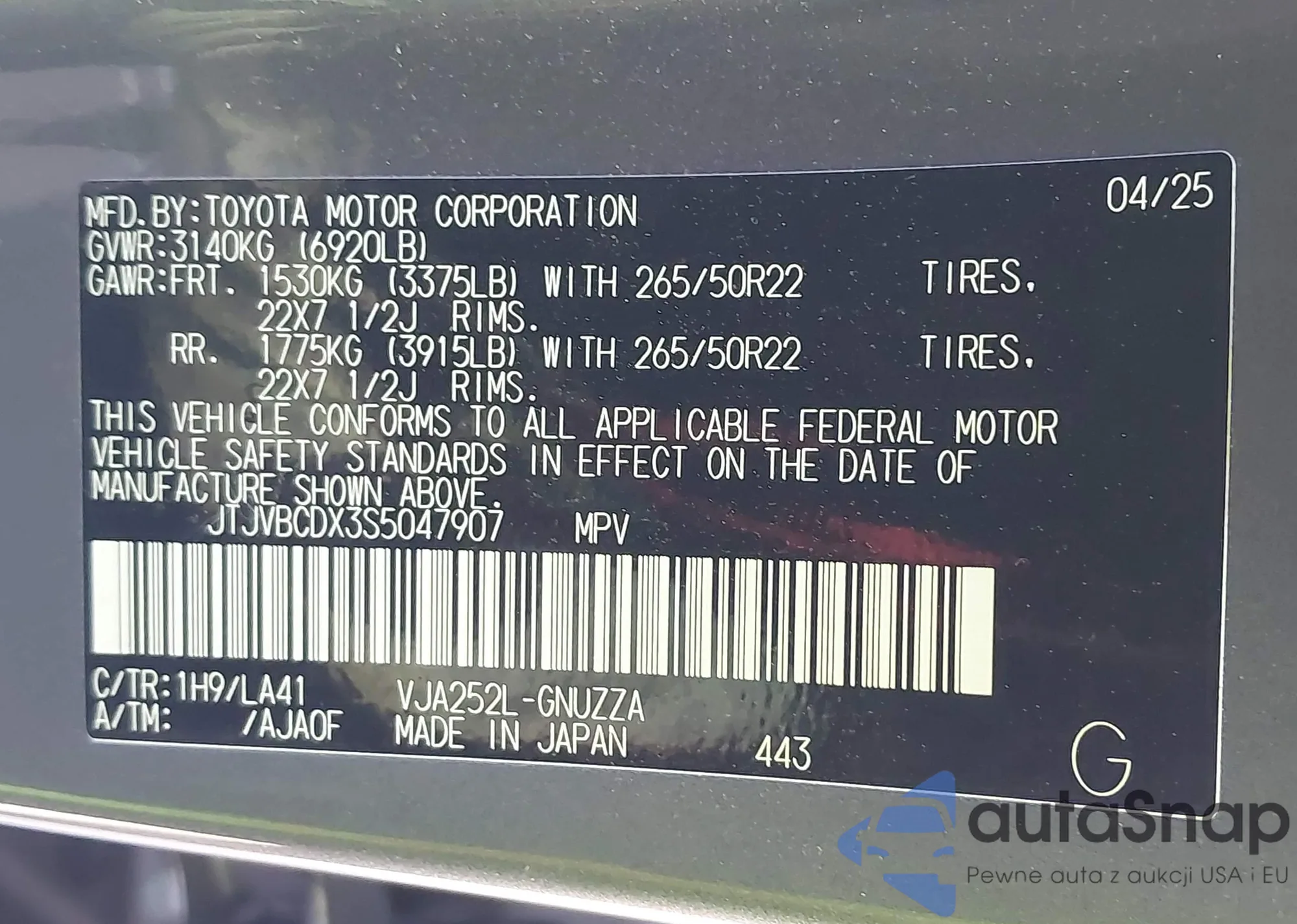 • VIN: JTJVBCDX3S5047907