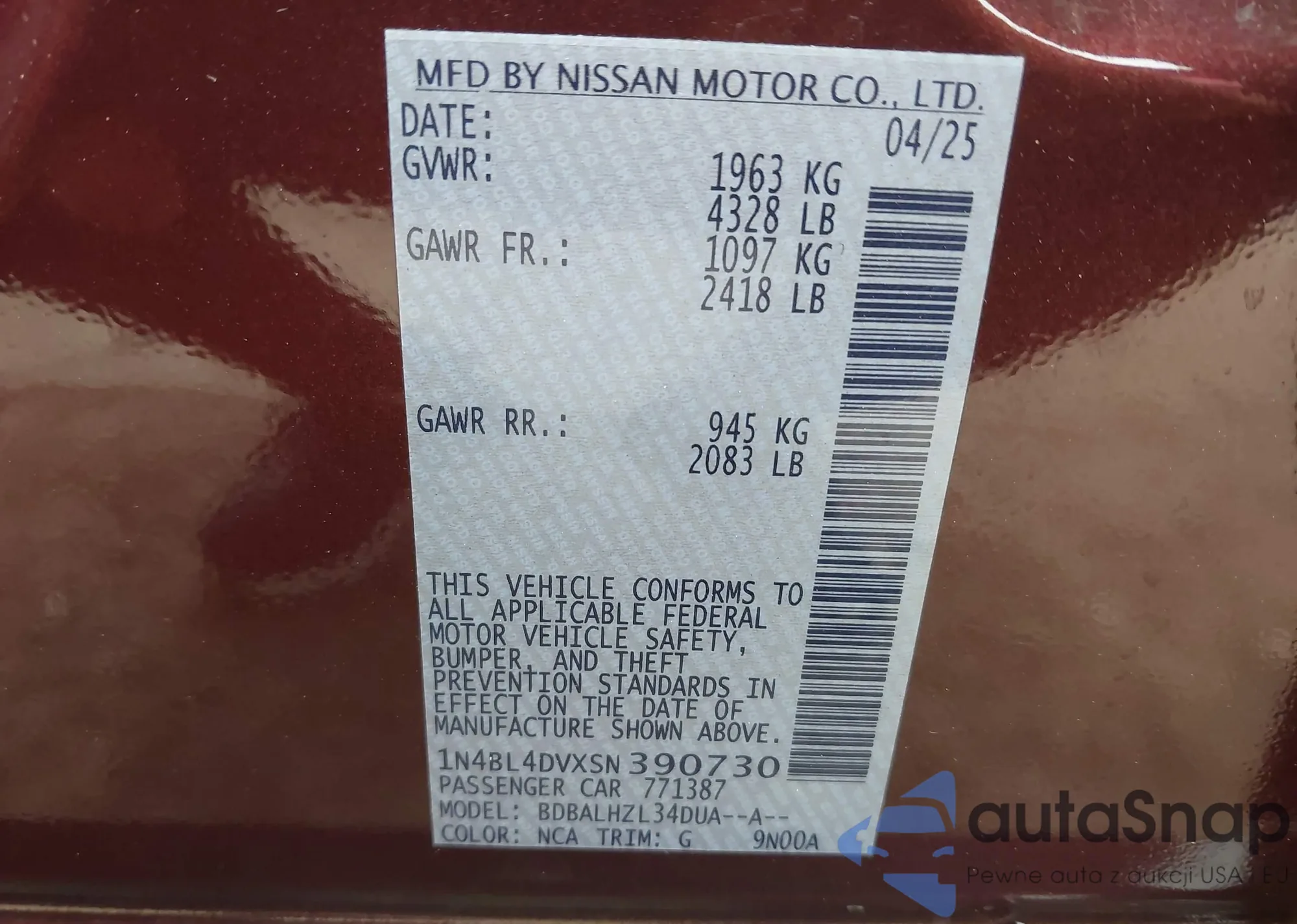 VIN: 1N4BL4DVXSN390730