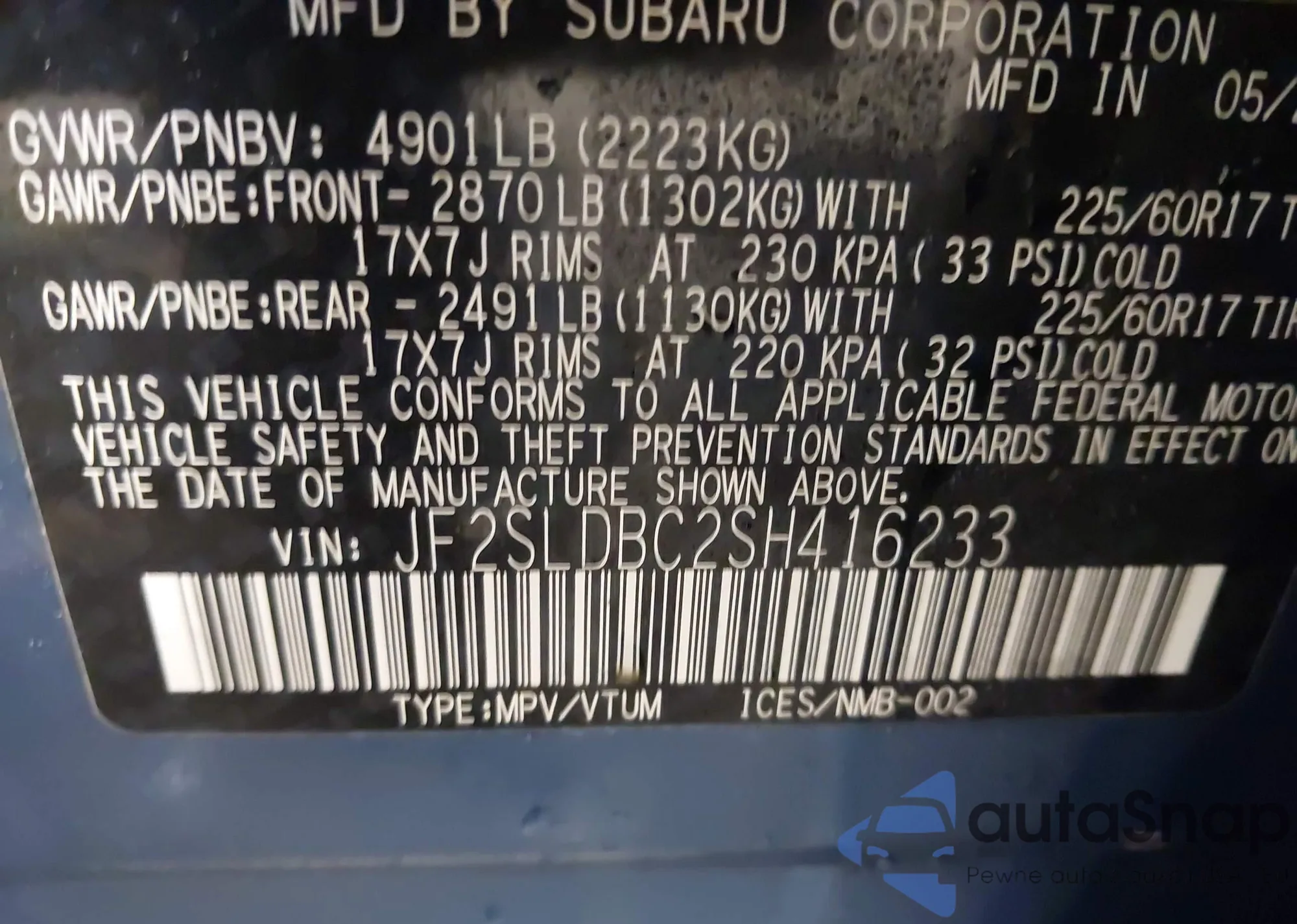 • VIN: JF2SLDBC2SH416233