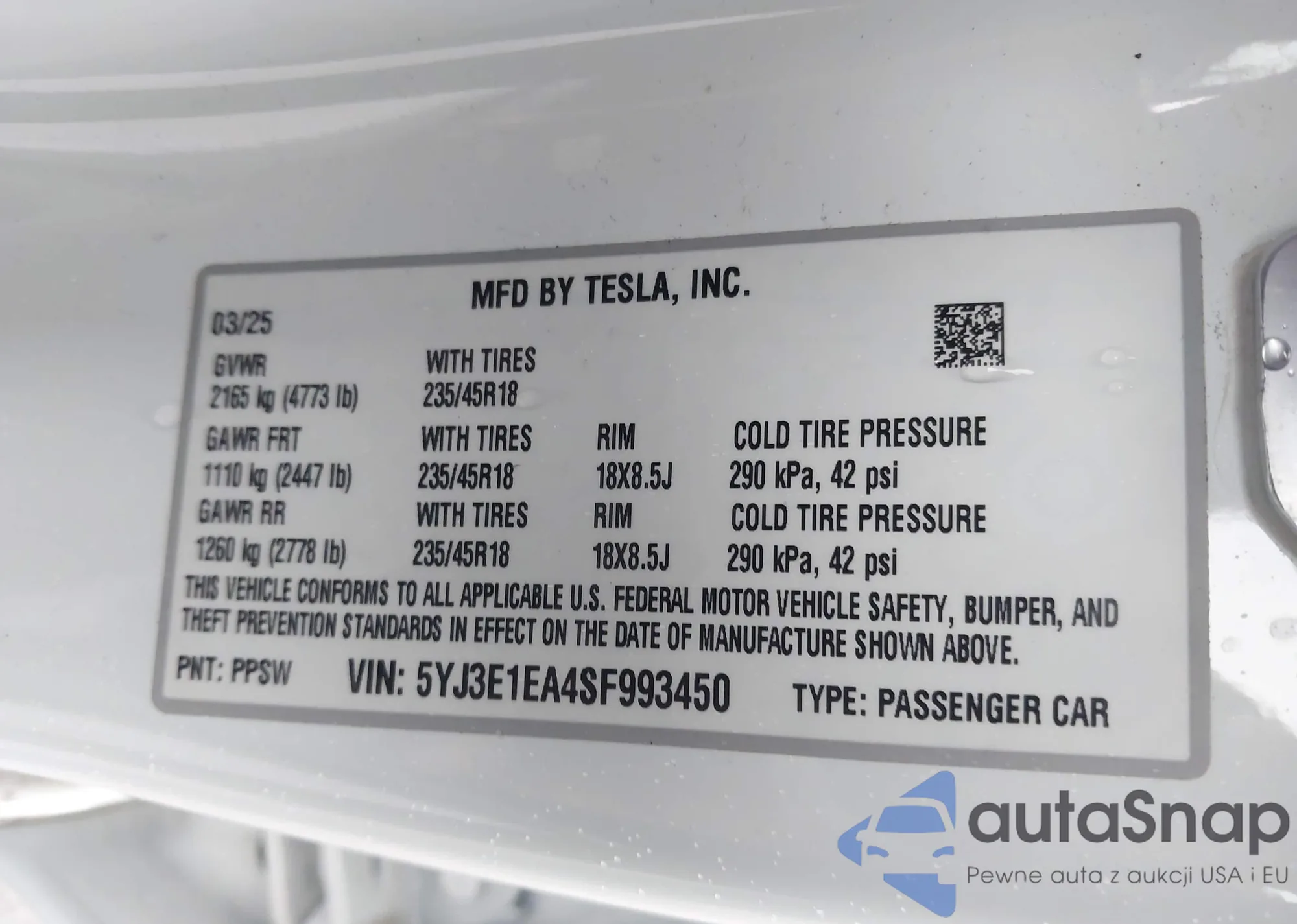 VIN: 5YJ3E1EA4SF993450