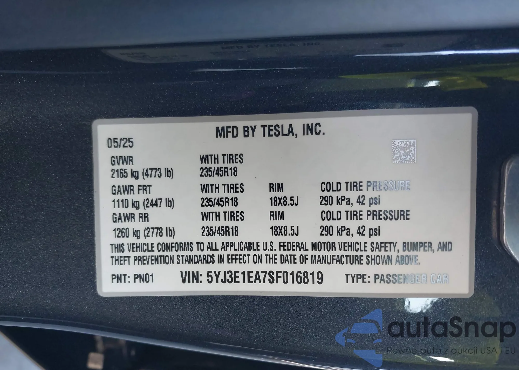 • VIN: 5YJ3E1EA7SF016819