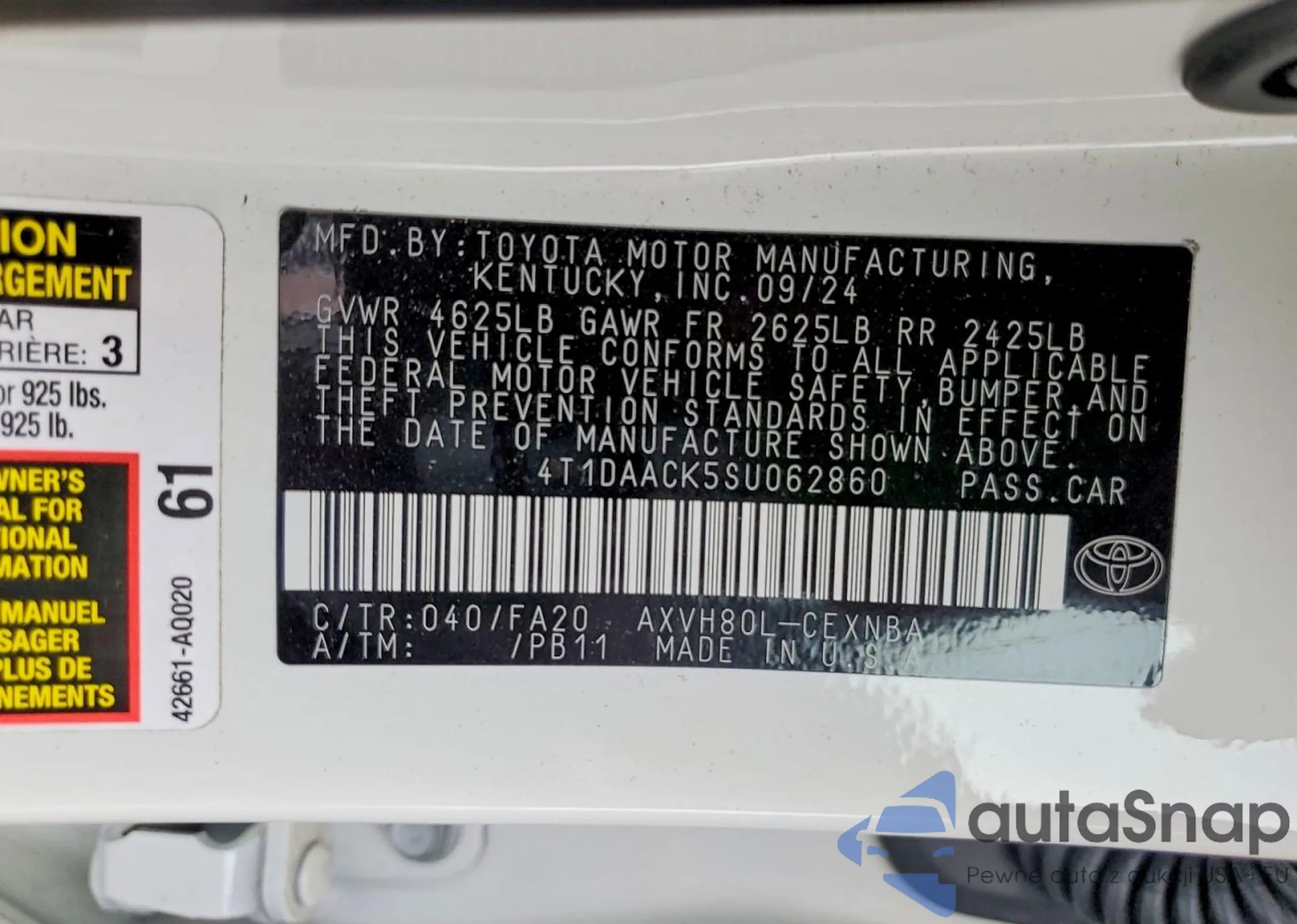 VIN: 4T1DAACK5SU062860