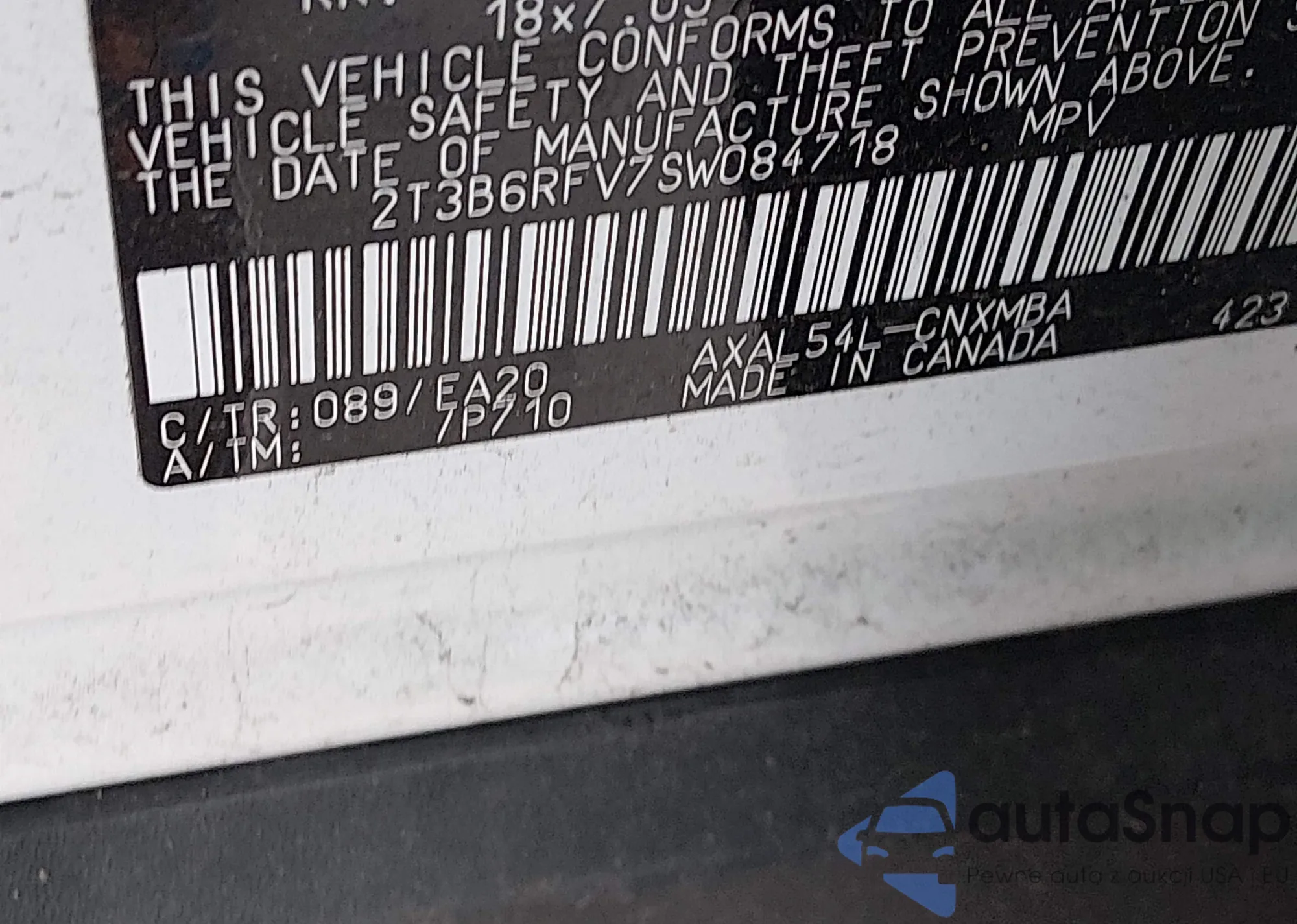 • VIN: 2T3B6RFV7SW084718