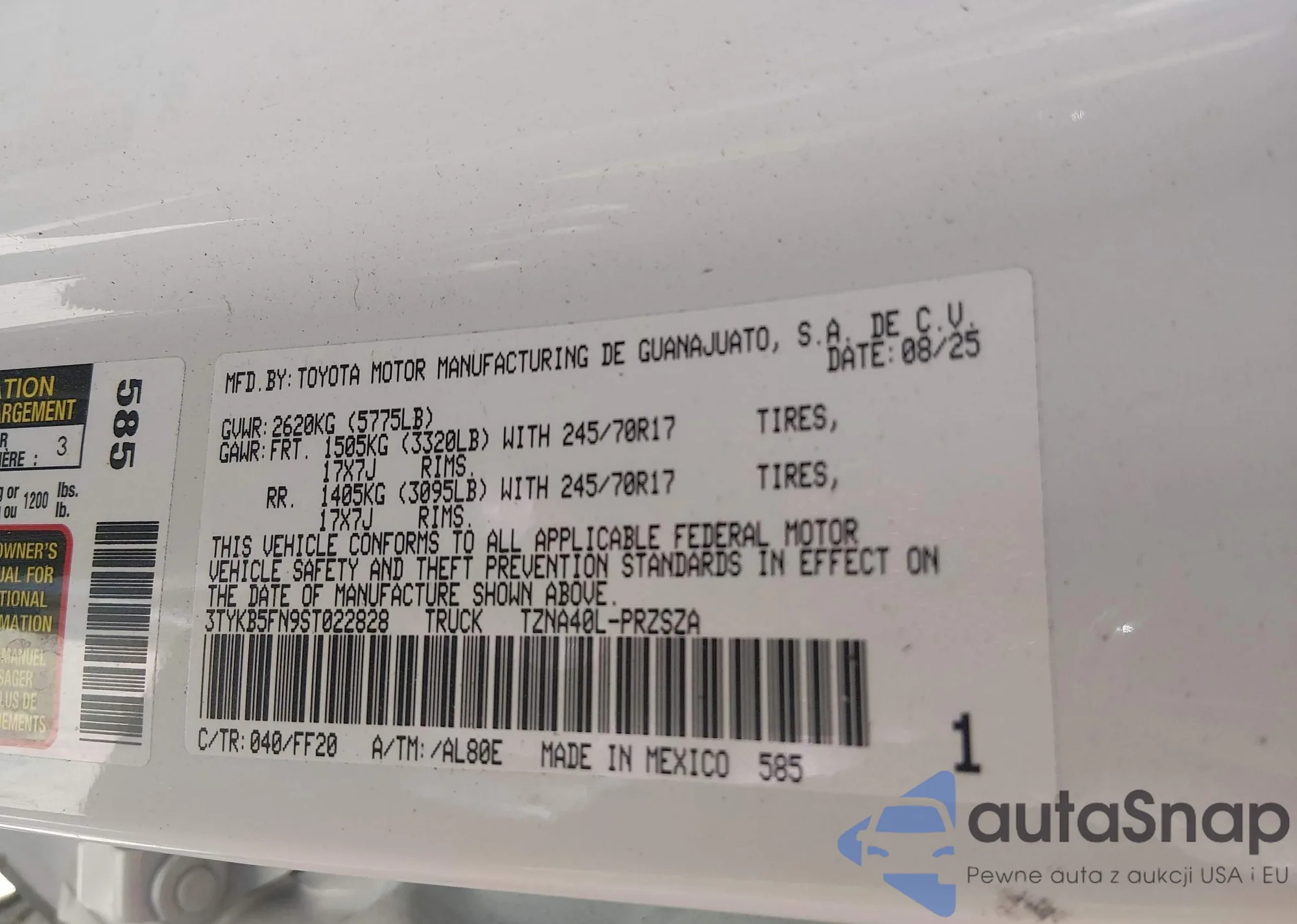Samochód Toyota Tacoma 2025 (VIN 3TYKB5FN9ST022828) ma dokumenty uniemożliwiające rejestrację. Mogą pojawić się trudności przy eksporcie i rejestracji. Skontaktuj się z ekspertami AutaSnap w celu znalezienia alternatywy.