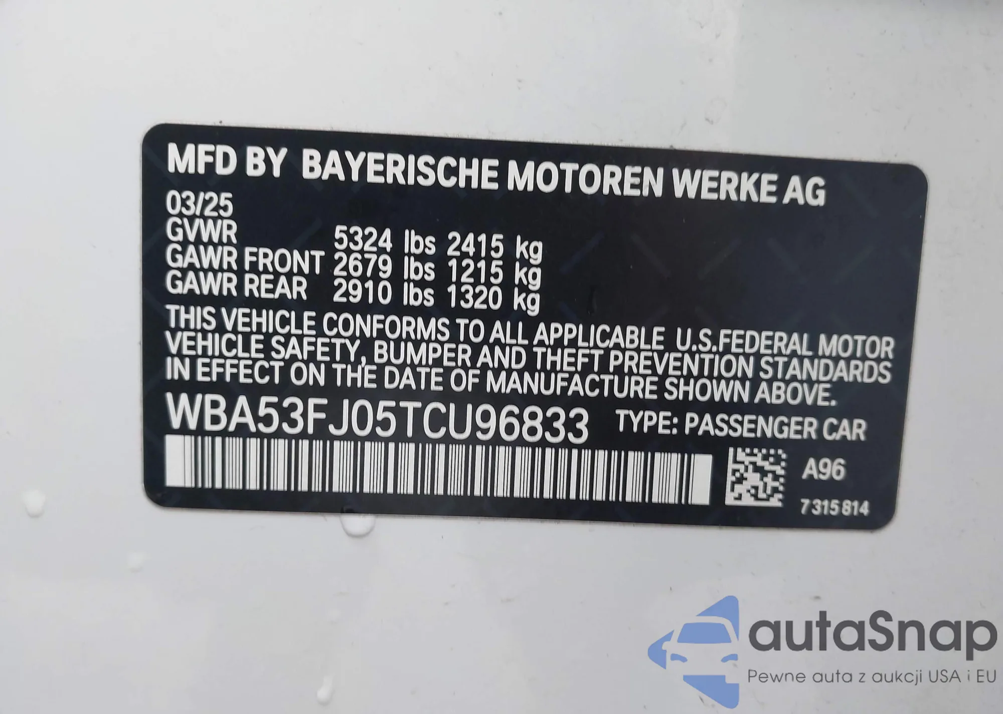 VIN: WBA53FJ05TCU96833