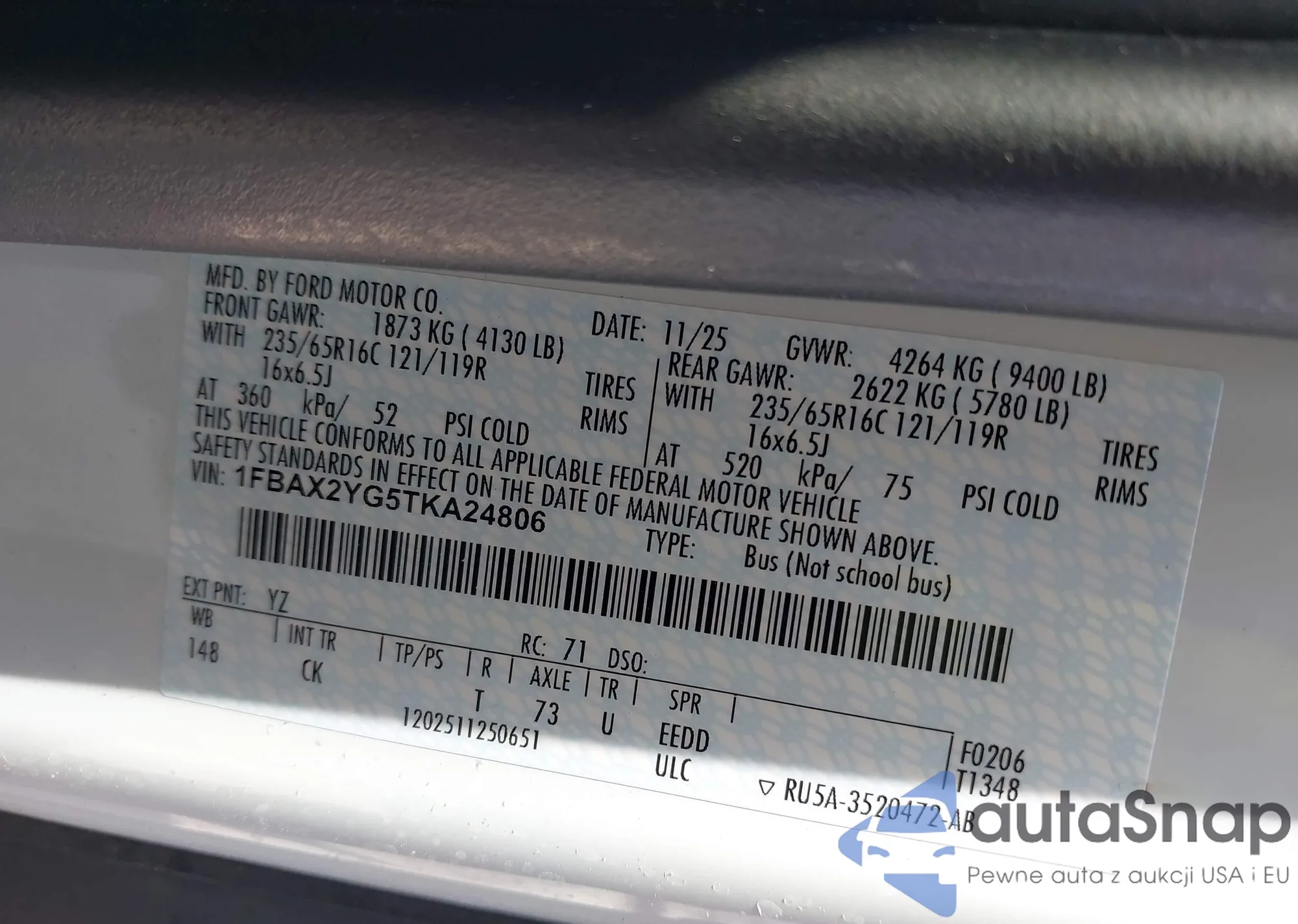 Samochód Ford Transit 2026 (VIN 1FBAX2YG5TKA24806) nie był wcześniej licytowany. Dokumenty są czyste, przebieg odpowiada lub jest niższy niż średnia rynku. Sprzedaje go firma ubezpieczeniowa – polecamy zakup. Dostawa do portu zajmie ok. 6–8 tygodni.
