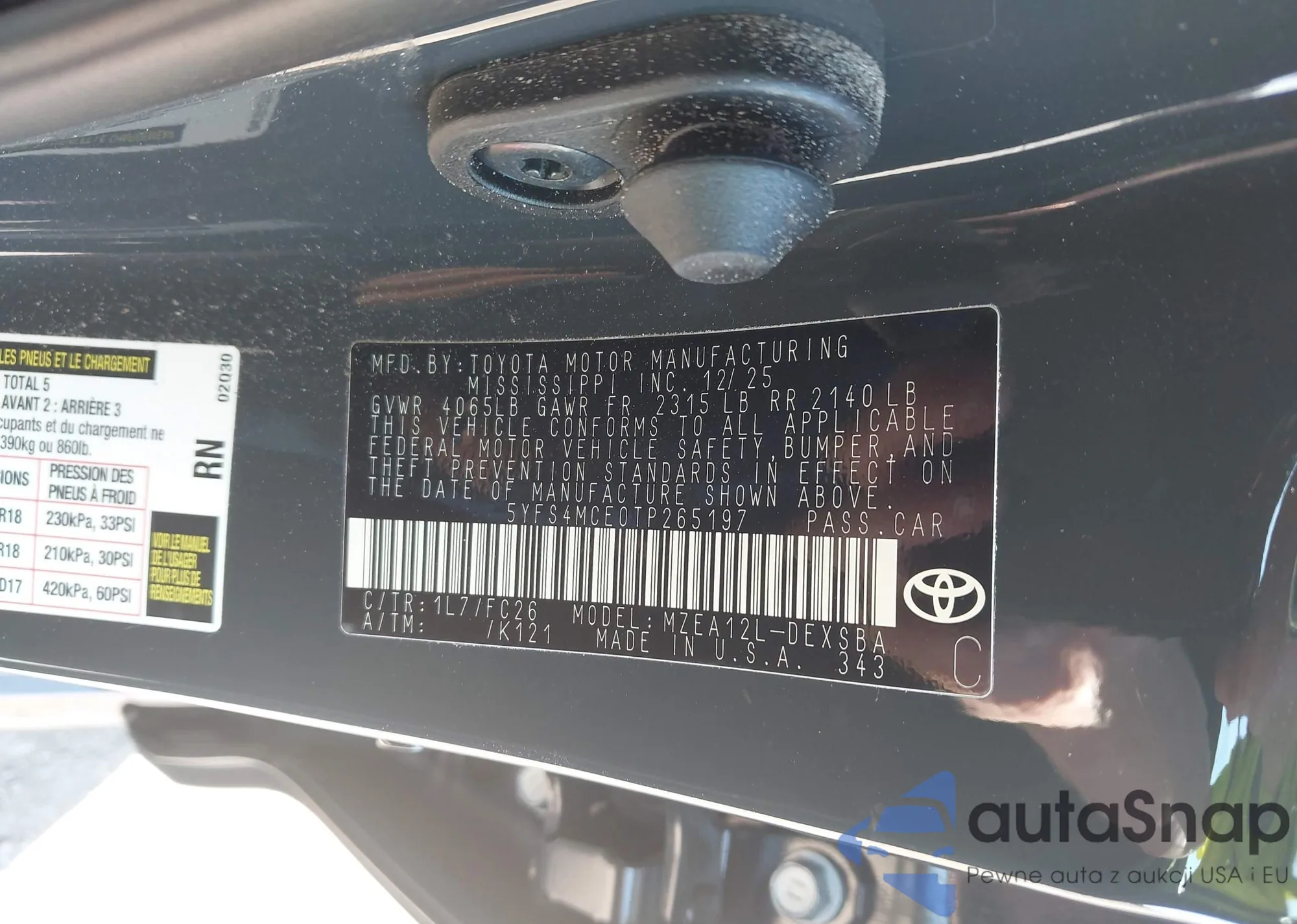 Samochód Toyota Corolla 2026 (VIN 5YFS4MCE0TP265197) ma dokumenty uniemożliwiające rejestrację. Mogą pojawić się trudności przy eksporcie i rejestracji. Skontaktuj się z ekspertami AutaSnap w celu znalezienia alternatywy.