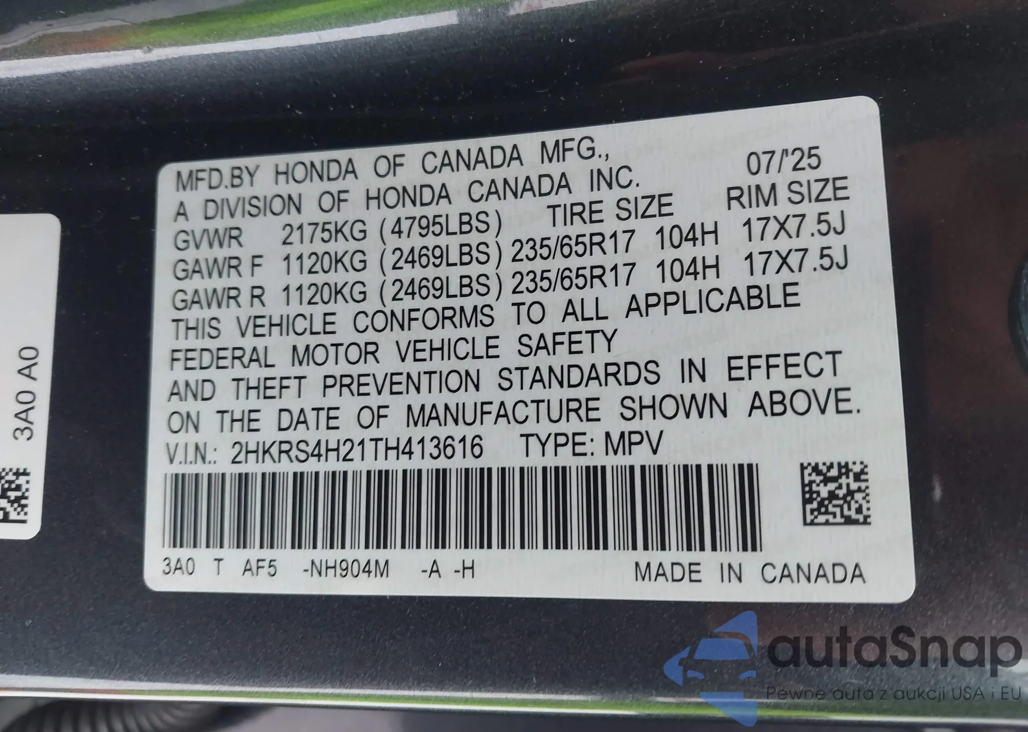 • VIN 2HKRS4H21TH413616