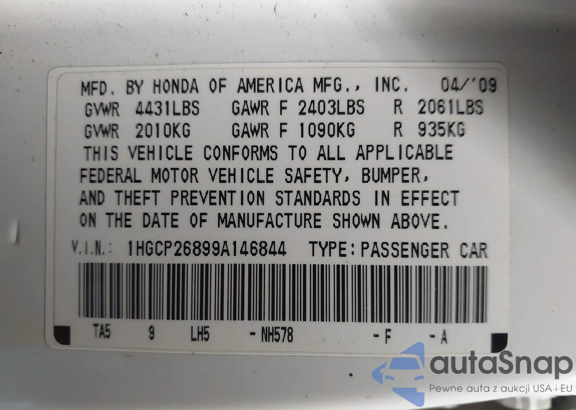 LOT: 44383031 VIN: 1HGCP26899A146844