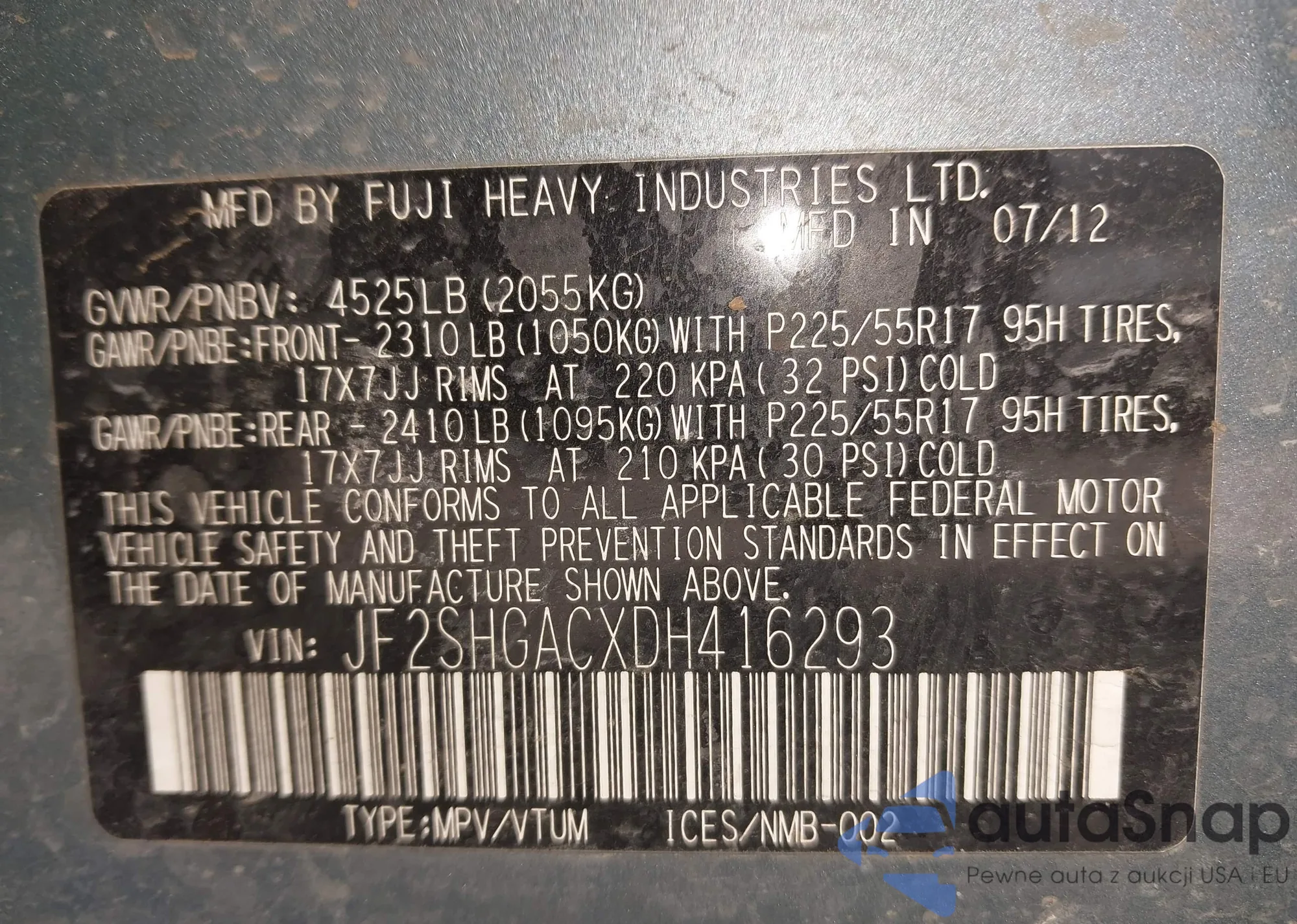 LOT: 43834268 VIN: JF2SHGACXDH416293
