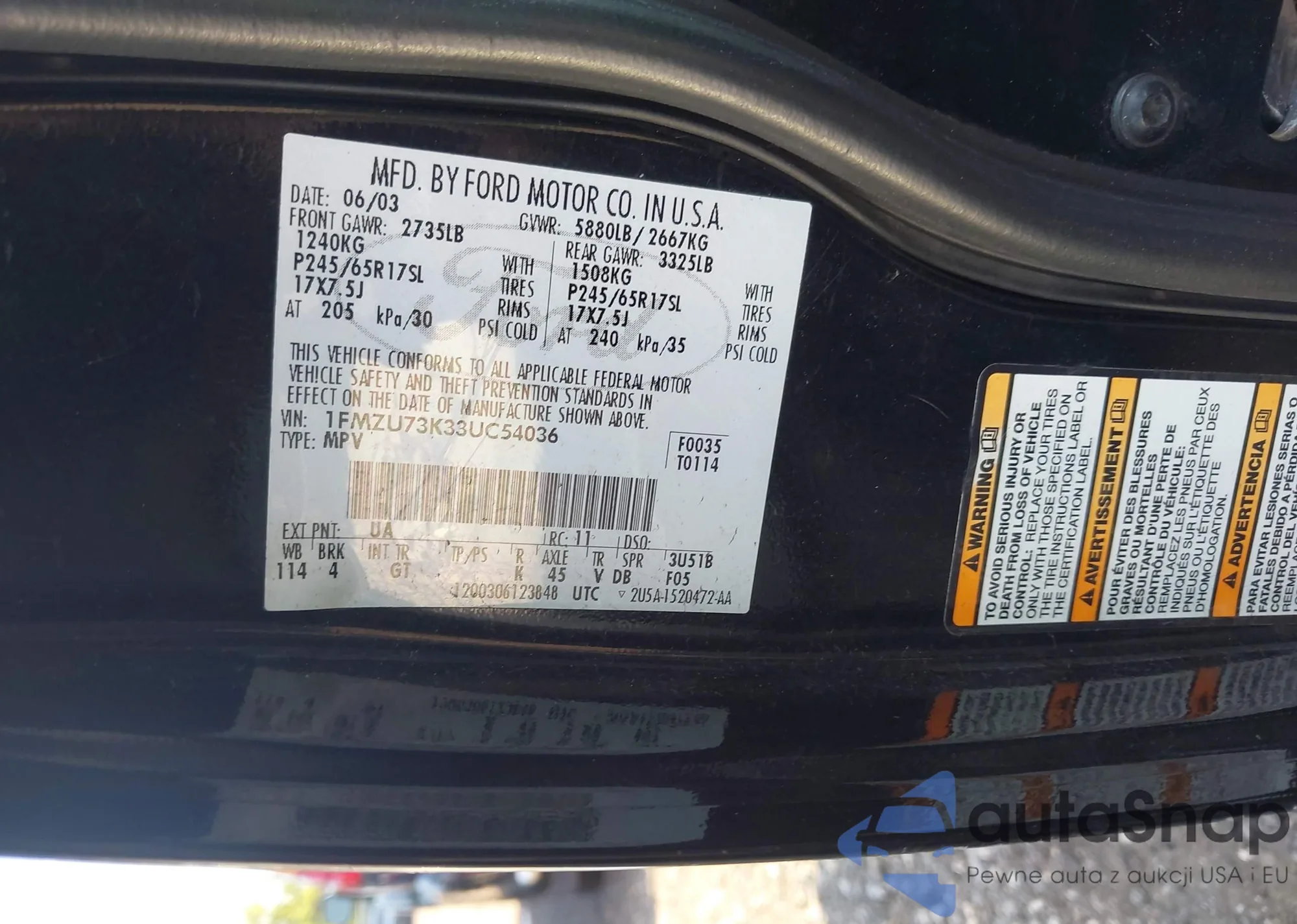 LOT: 42997491 VIN: 1FMZU73K33UC54036