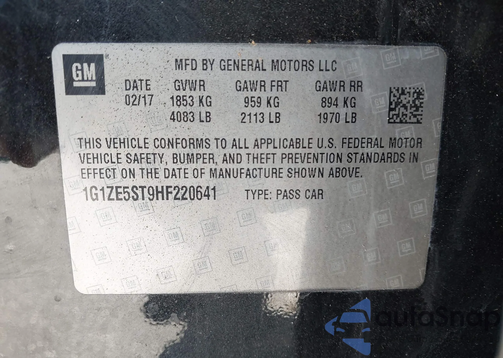 • VIN 1G1ZE5ST9HF220641
