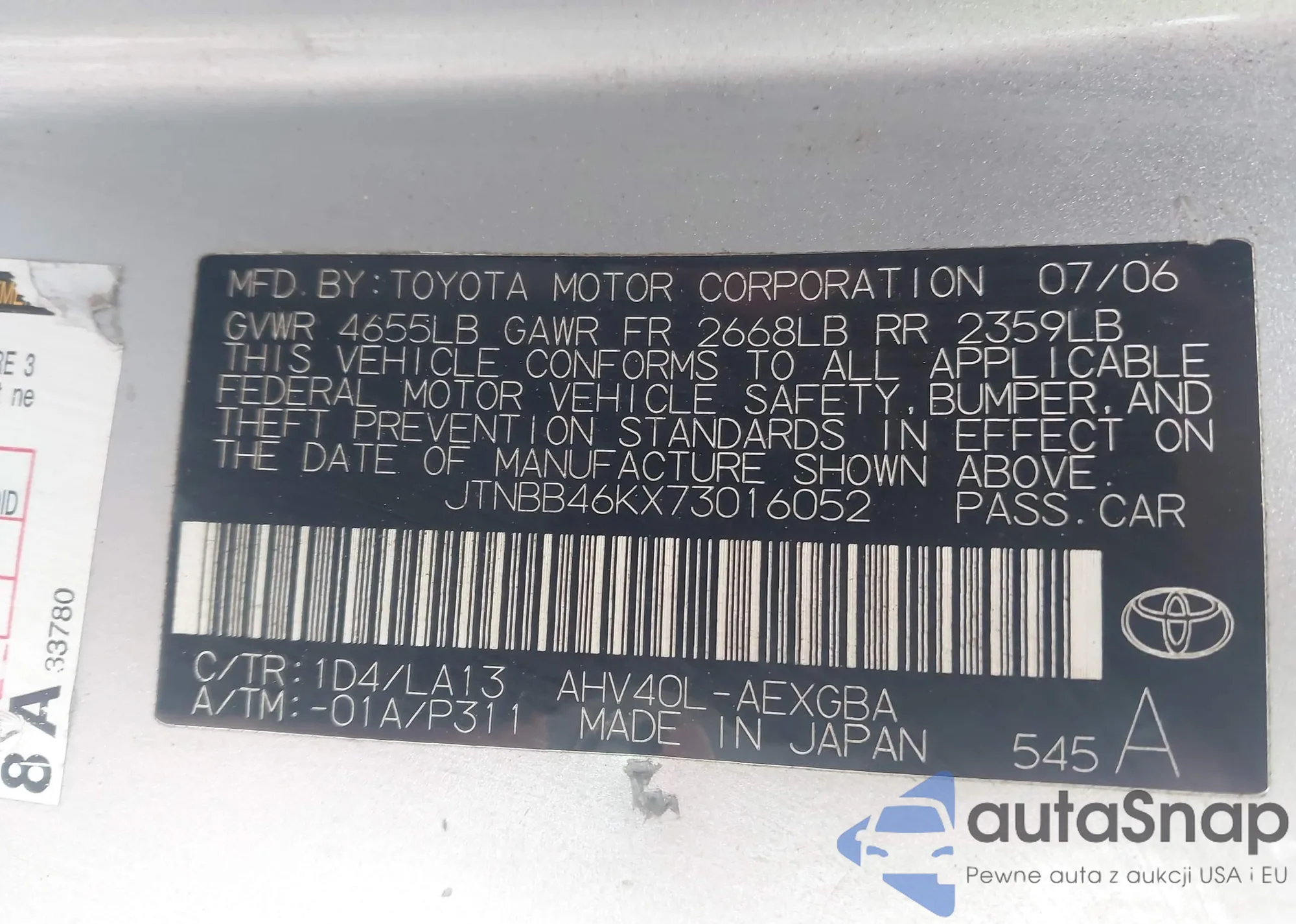 LOT: 44032941 VIN: JTNBB46KX73016052