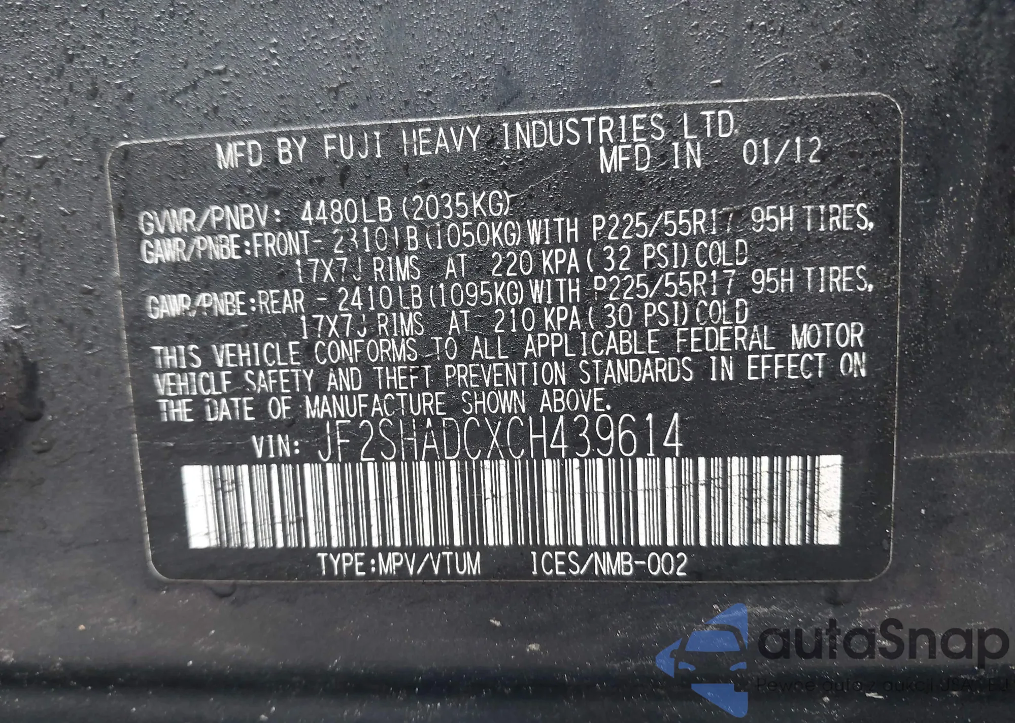 • VIN JF2SHADCXCH439614
