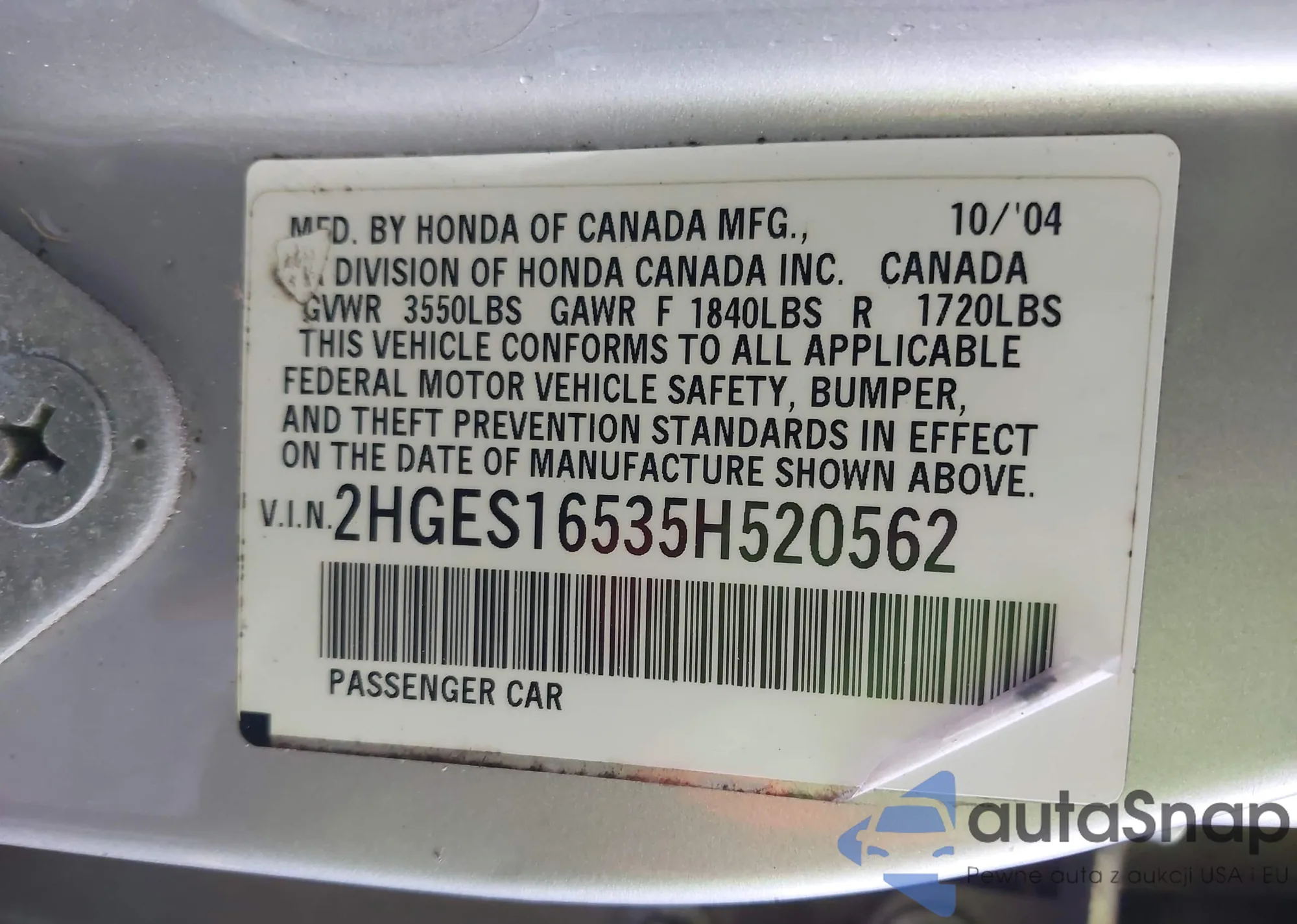 LOT: 43608244 VIN: 2HGES16535H520562