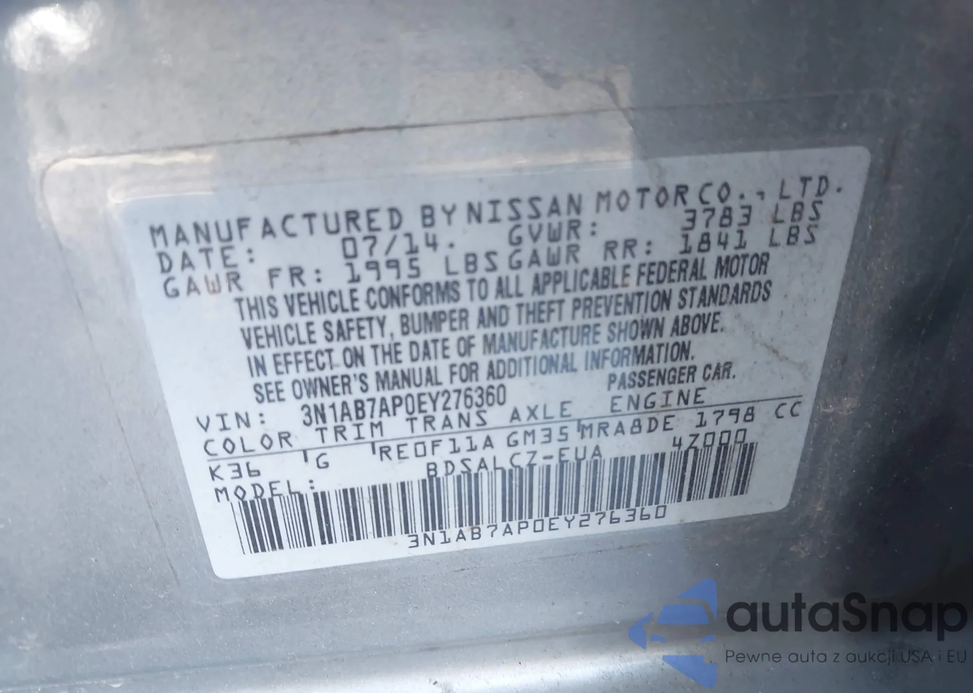 LOT: 43950368 VIN: 3N1AB7AP0EY276360