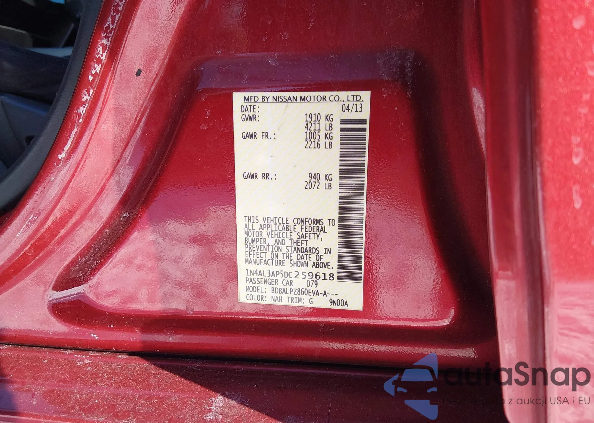 • VIN 1N4AL3AP5DC259618