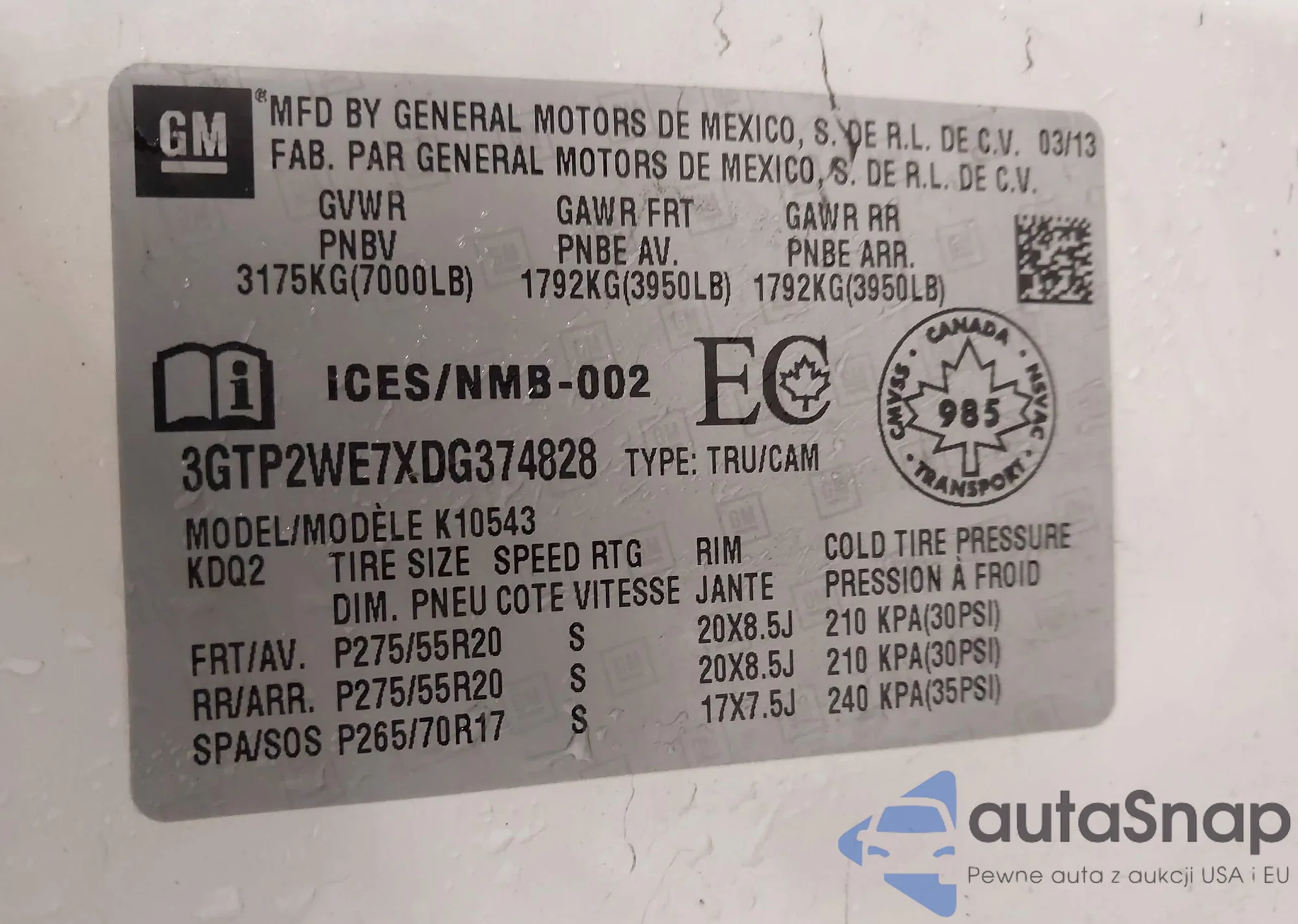 • VIN 3GTP2WE7XDG374828
