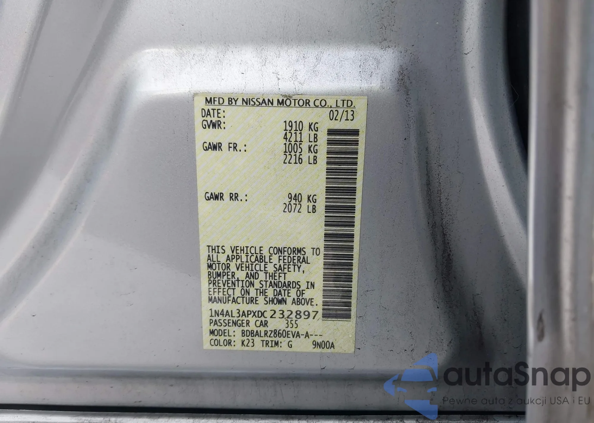 LOT: 44085130 VIN: 1N4AL3APXDC232897