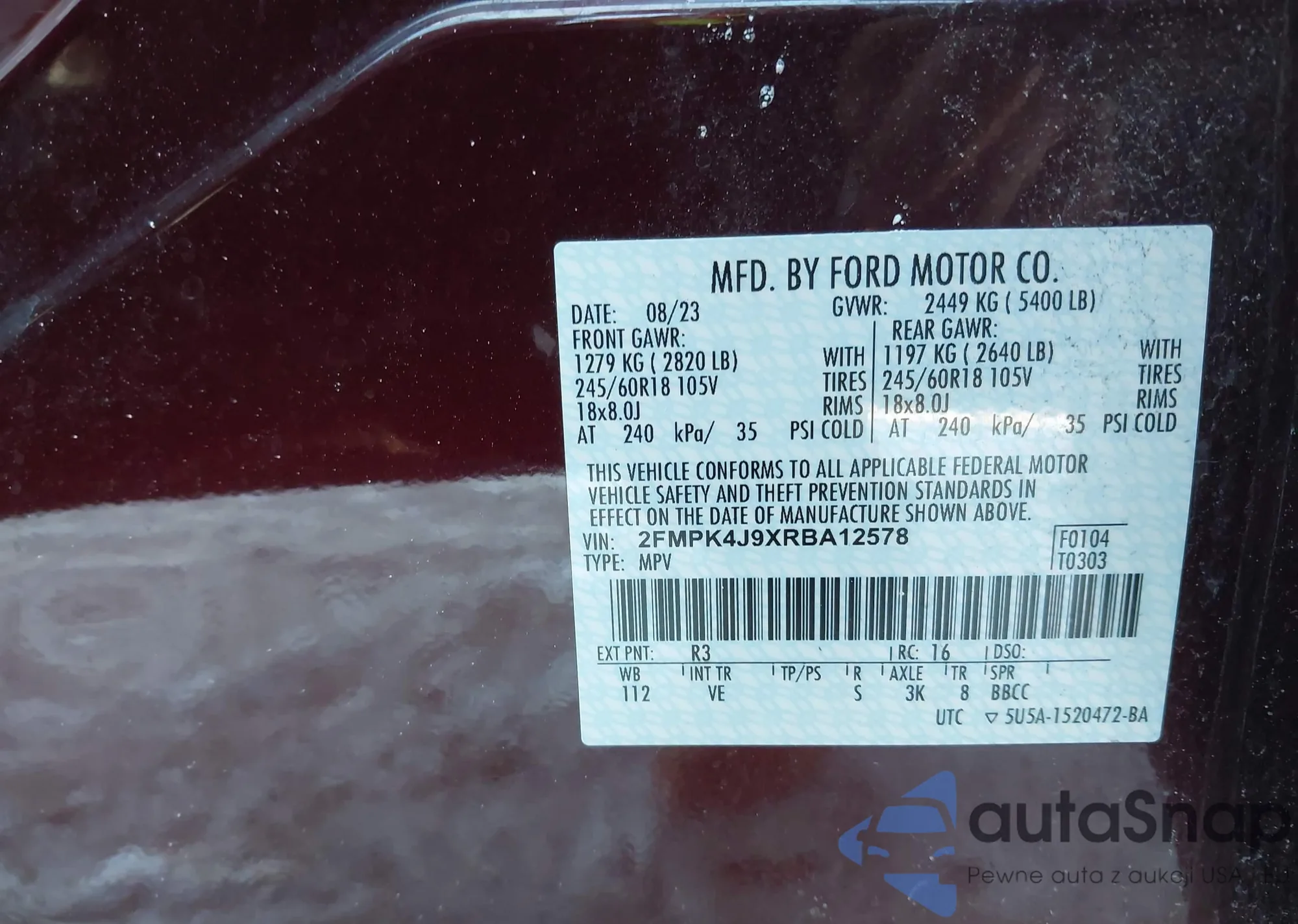 • VIN 2FMPK4J9XRBA12578