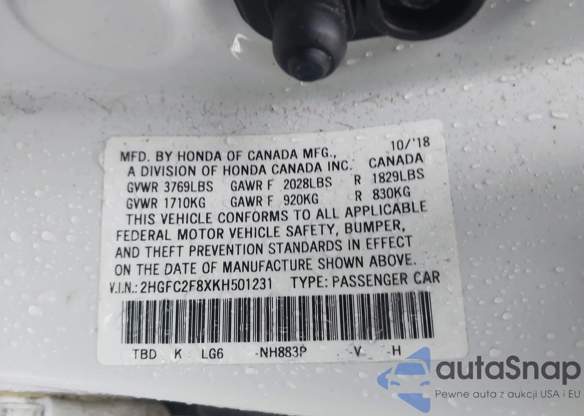 • VIN 2HGFC2F8XKH501231