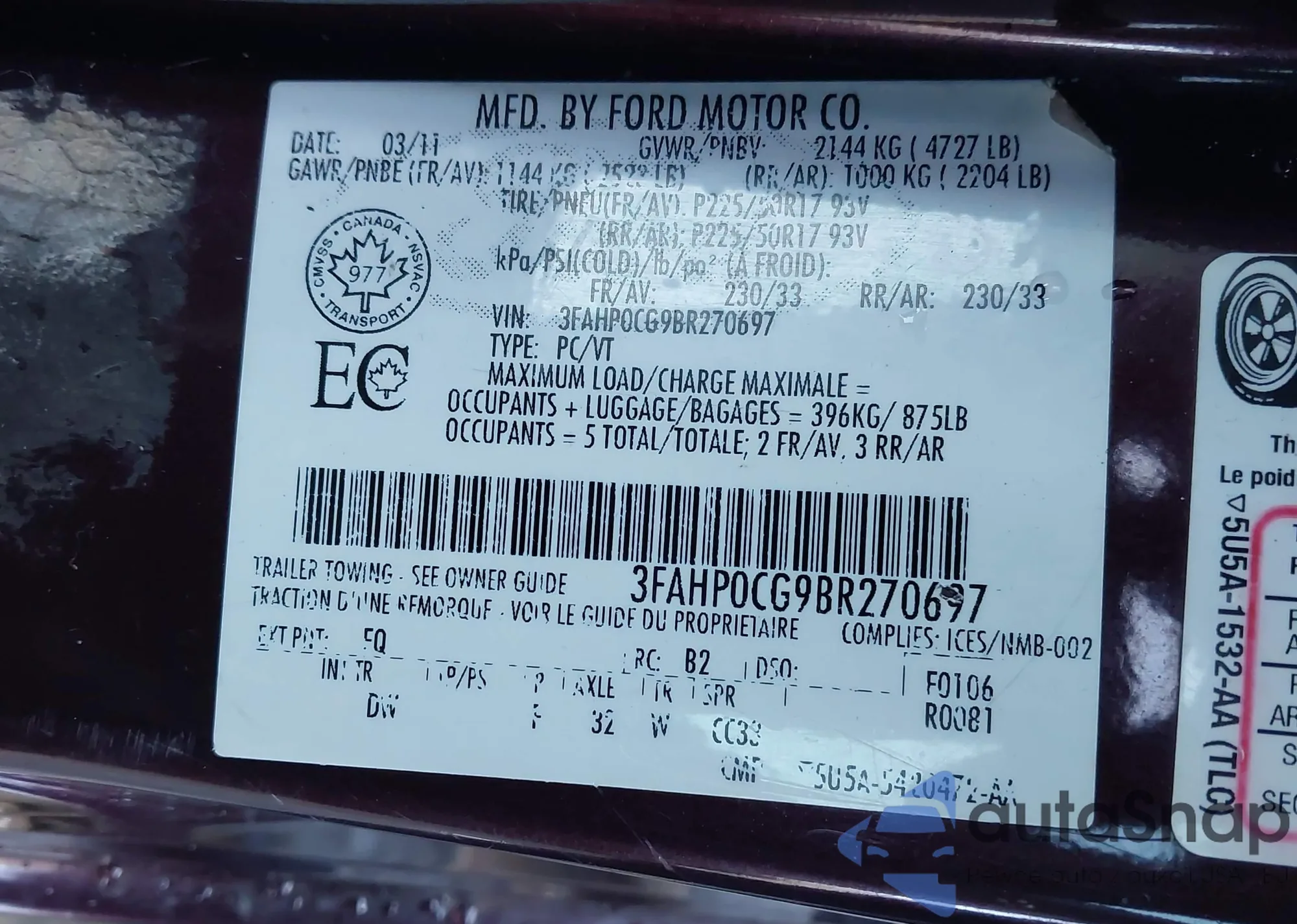 • VIN 3FAHP0CG9BR270697