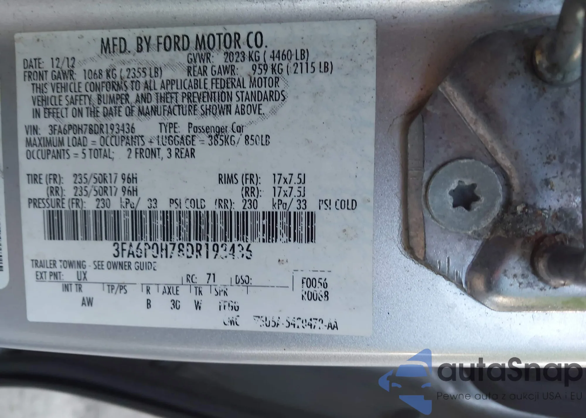 LOT: 43504461 VIN: 3FA6P0H78DR193436