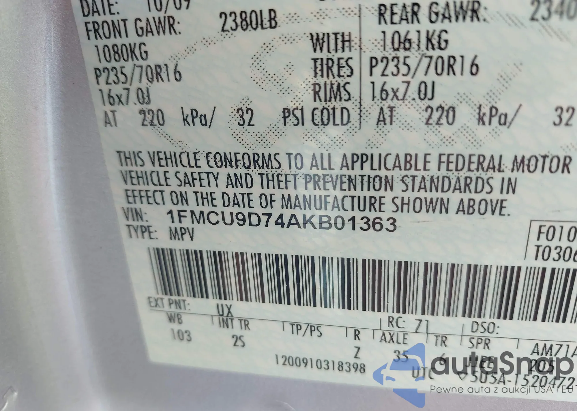 LOT: 43655251 VIN: 1FMCU9D74AKB01363