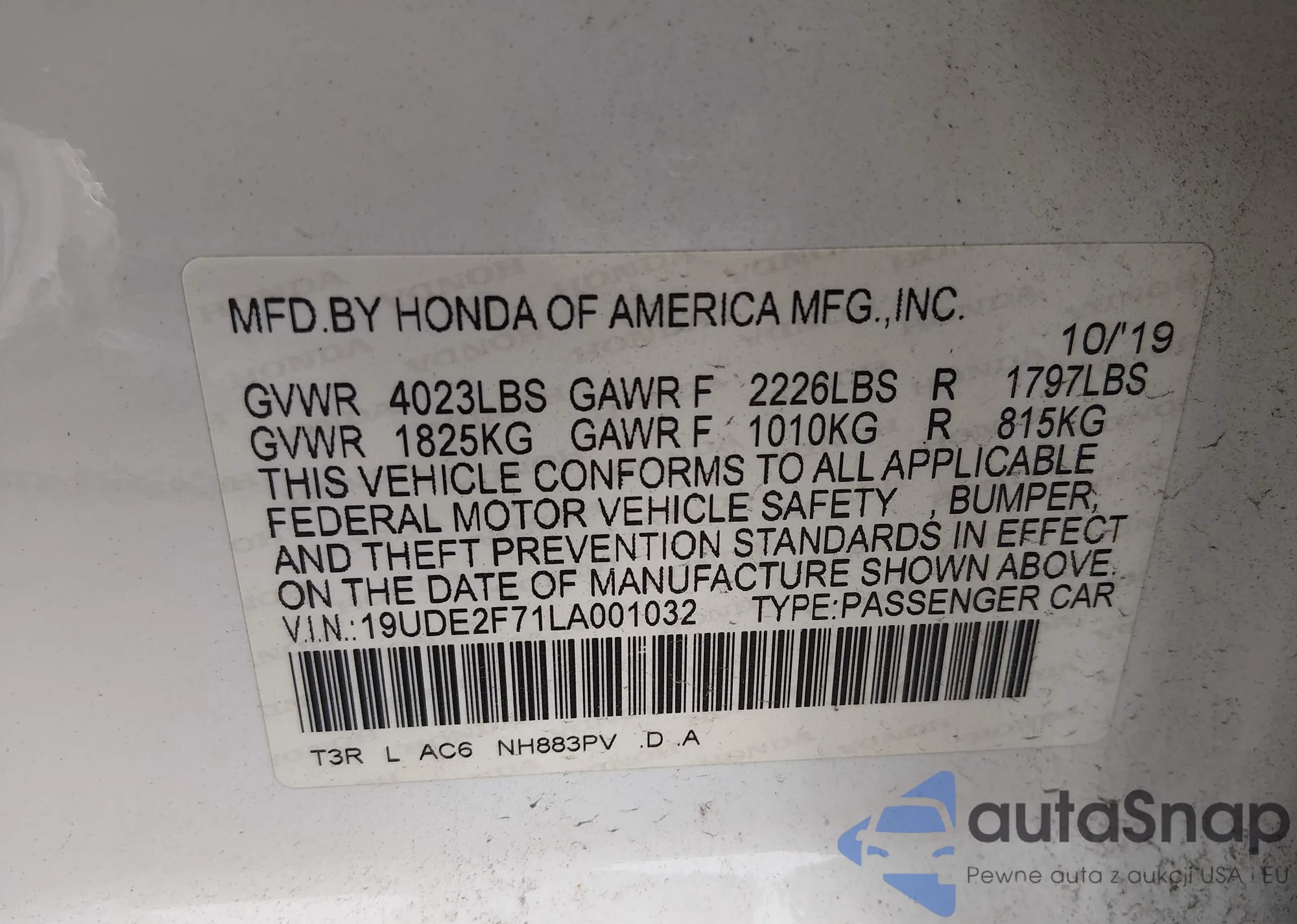 LOT: 44356984 VIN: 19UDE2F71LA001032