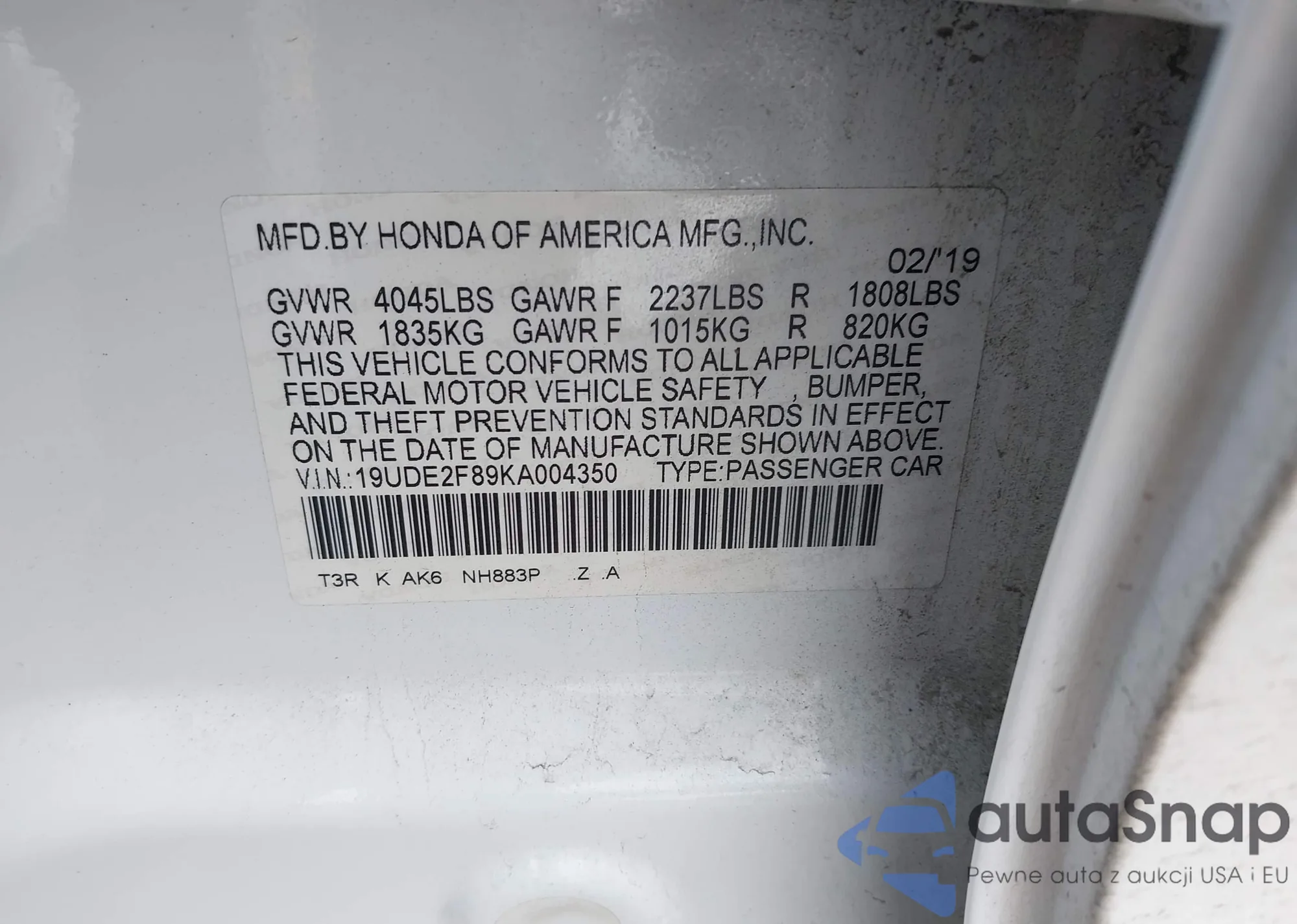 • VIN 19UDE2F89KA004350