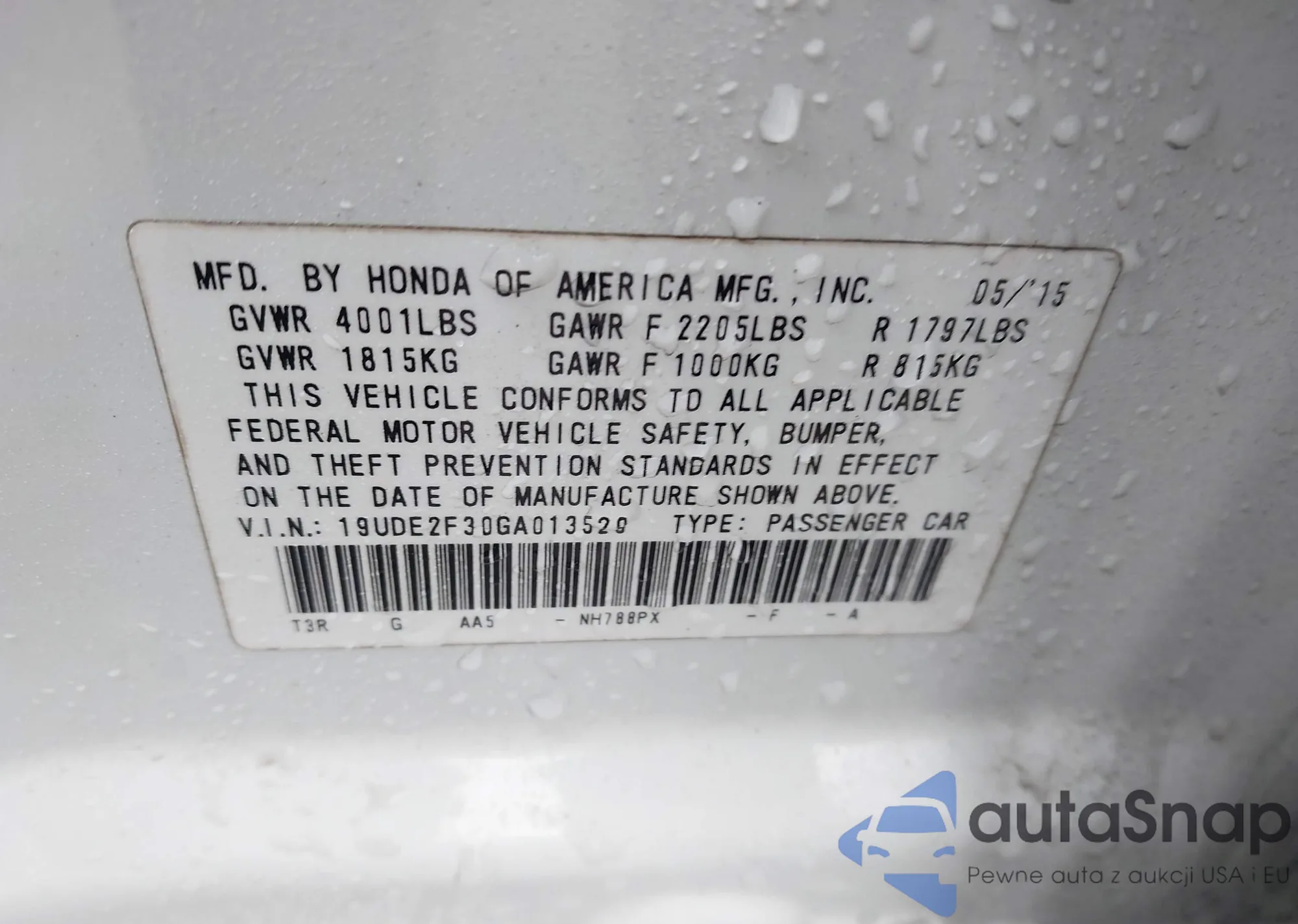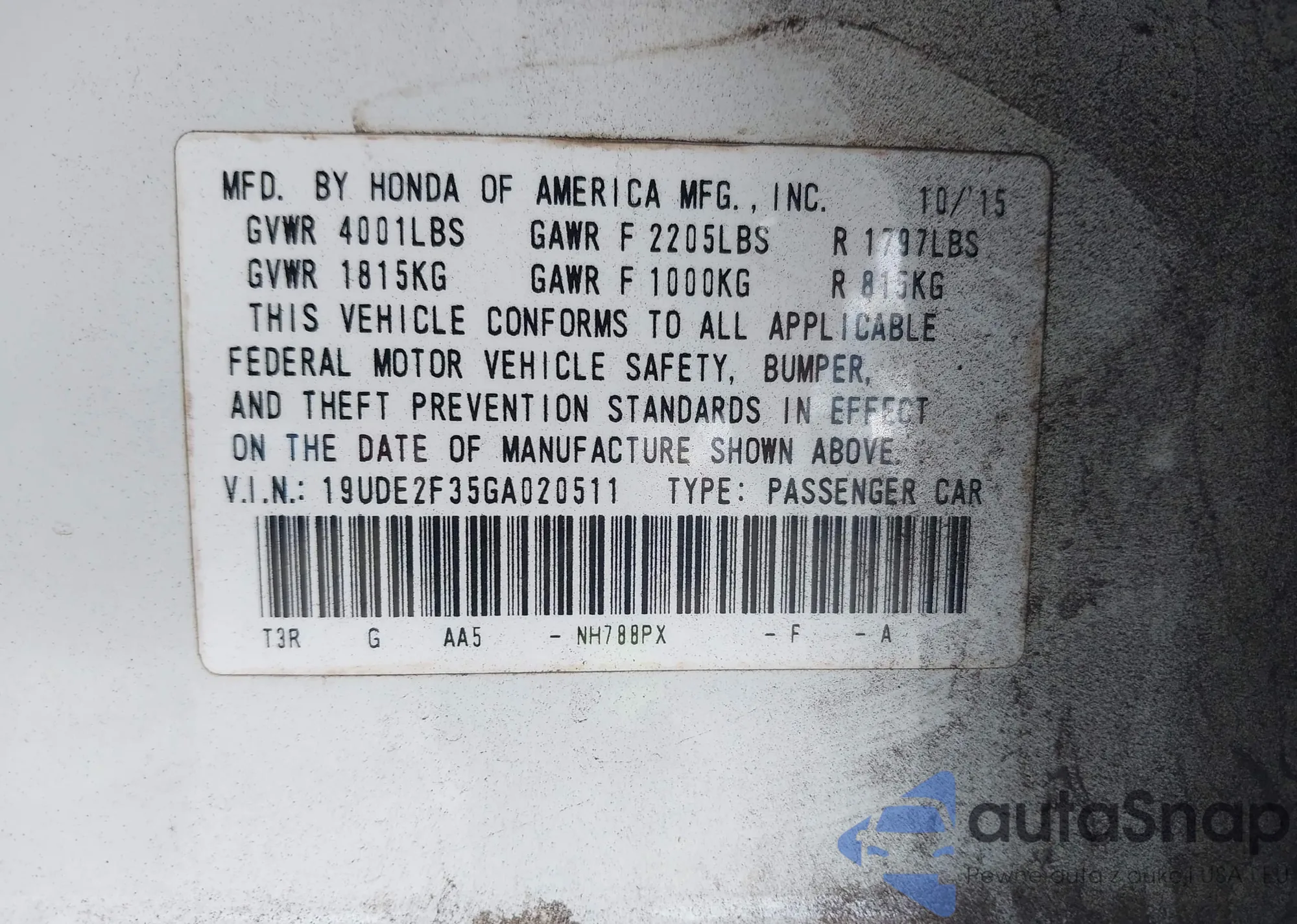 • VIN 19UDE2F79GA011815