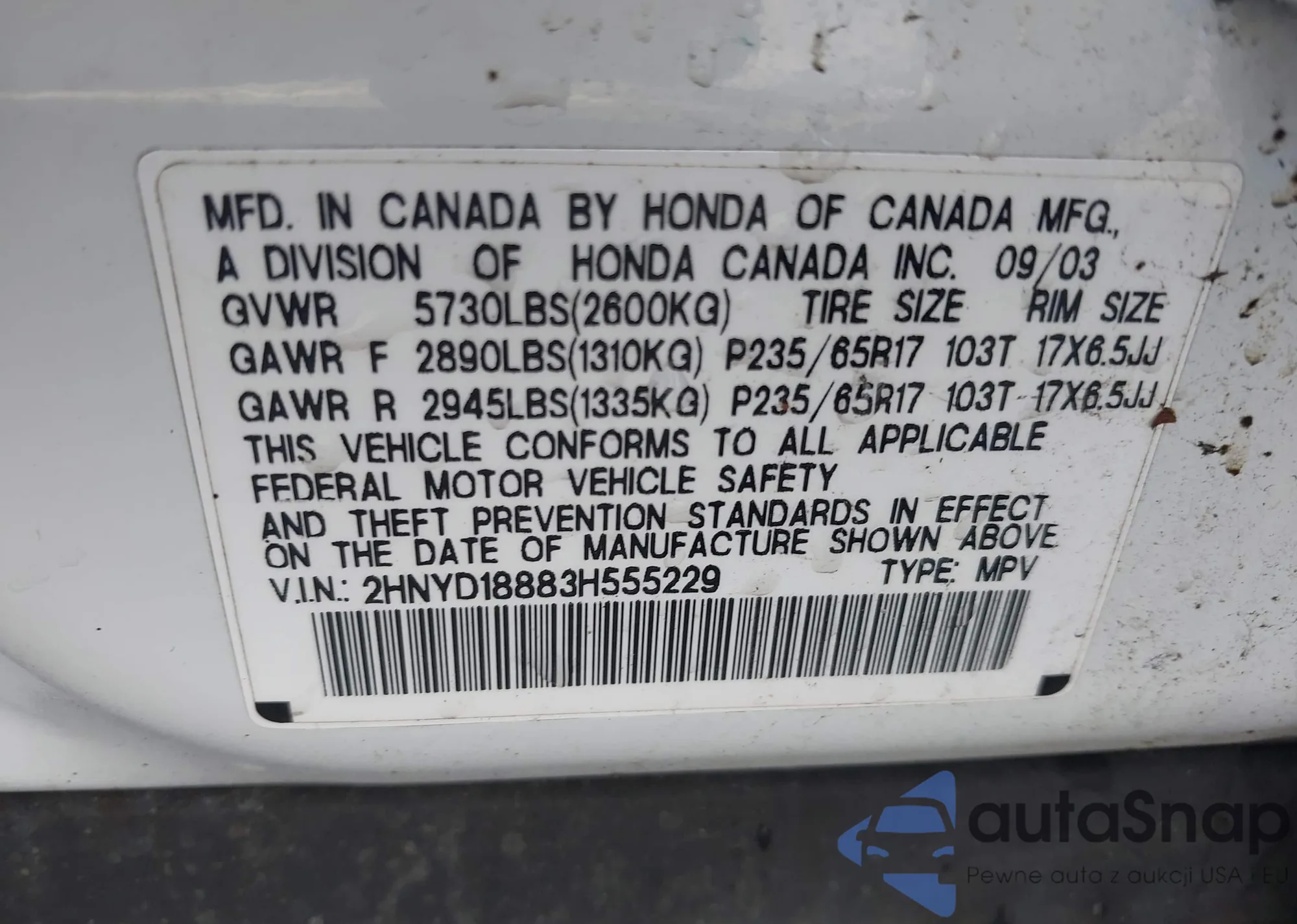 LOT: 44350372 VIN: 2HNYD18883H555229
