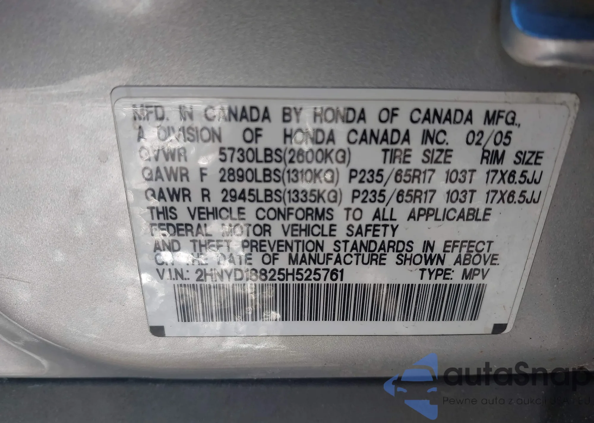 LOT: 44384070 VIN: 2HNYD18825H525761