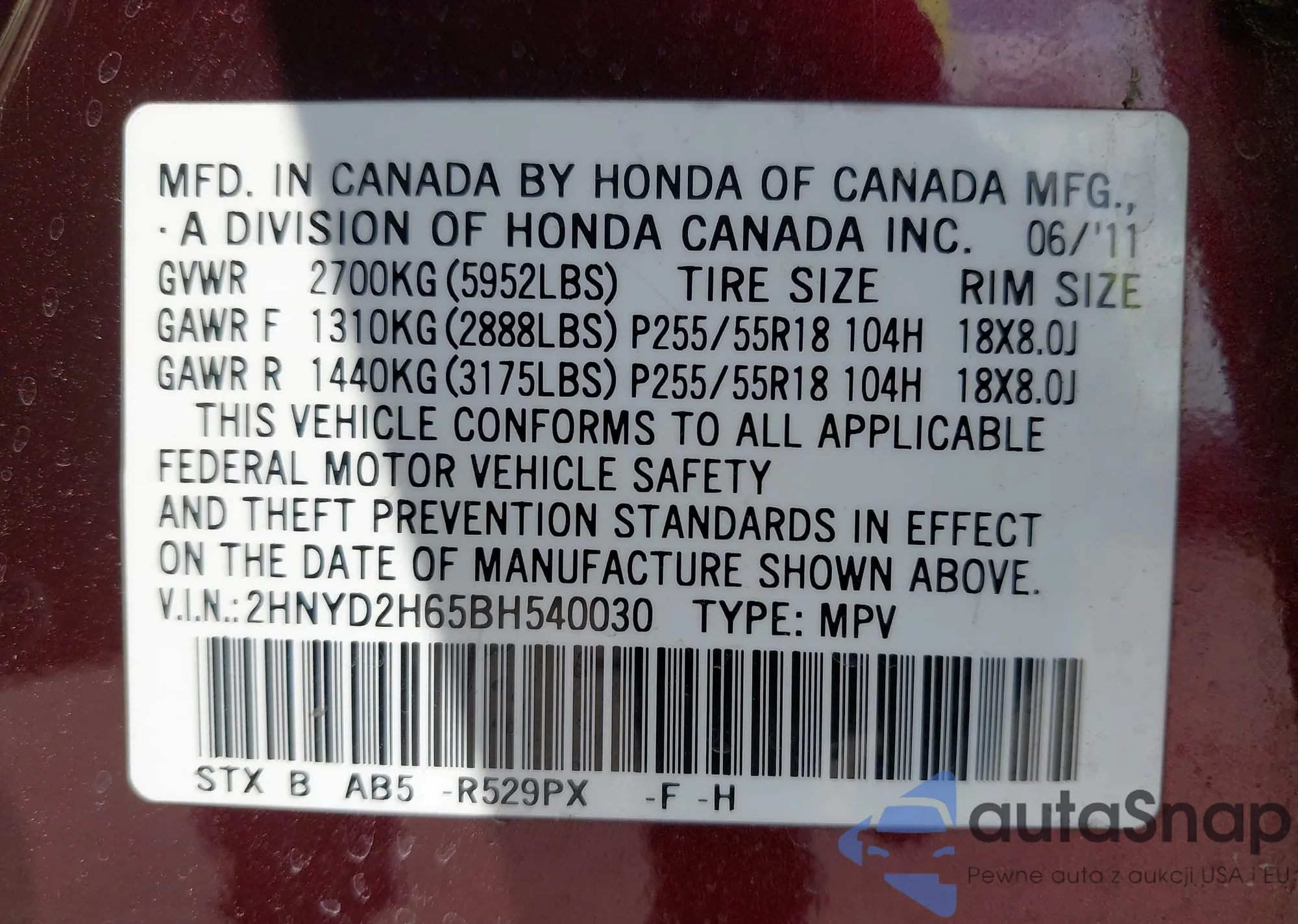 LOT: 42519238 VIN: 2HNYD2H65BH540030
