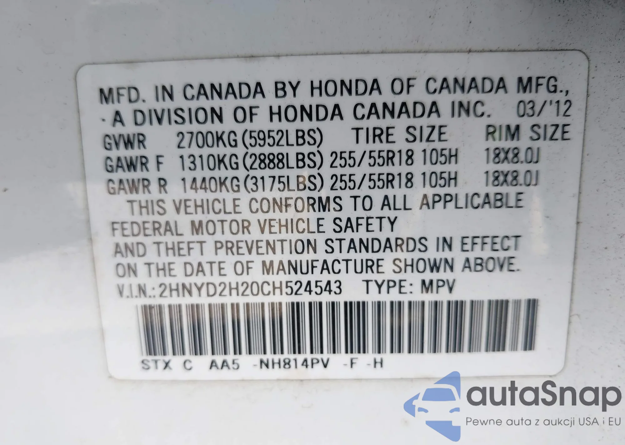 • VIN 2HNYD2H2OCH524543