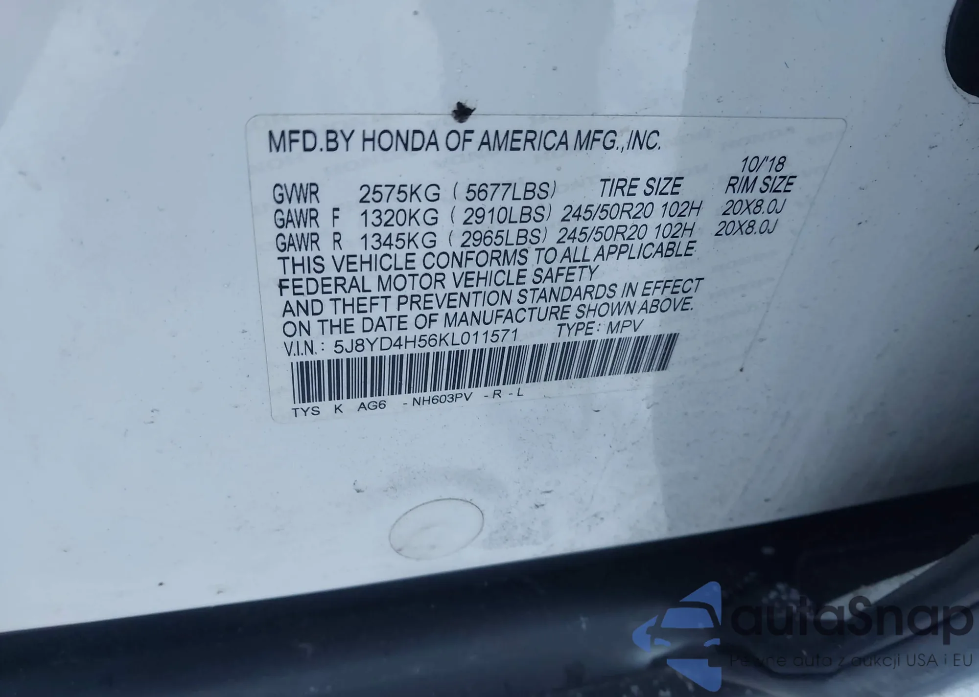 • VIN 5J8YD4H56KL011571