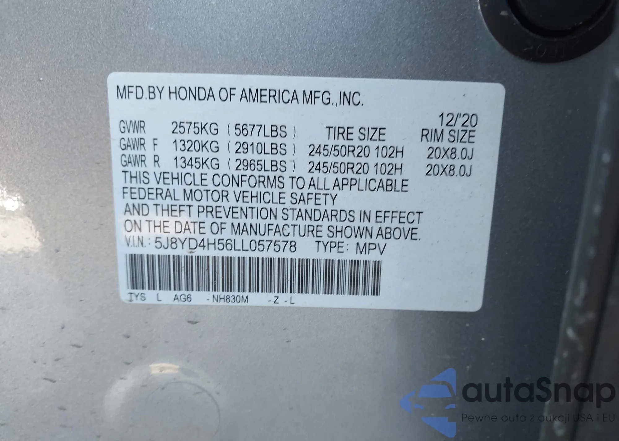 LOT: 44346947 VIN: 5J8YD4H56LL057578