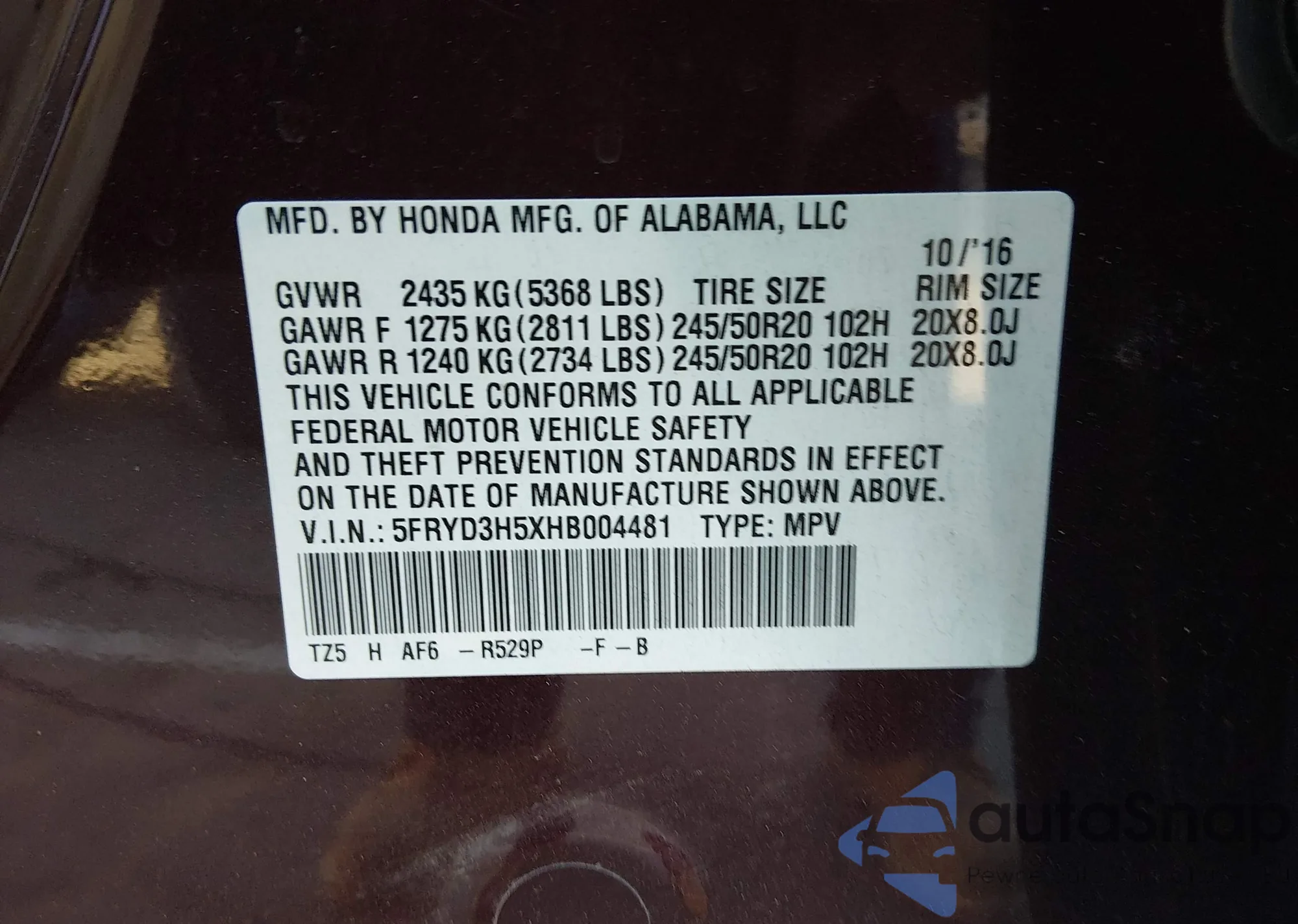 • VIN 5FRYD3H5XHB004481