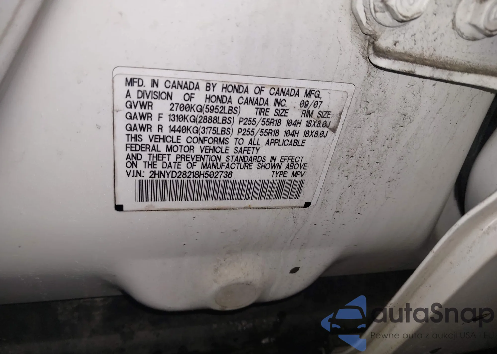 LOT: 44225342 VIN: 2HNYD28218H502736