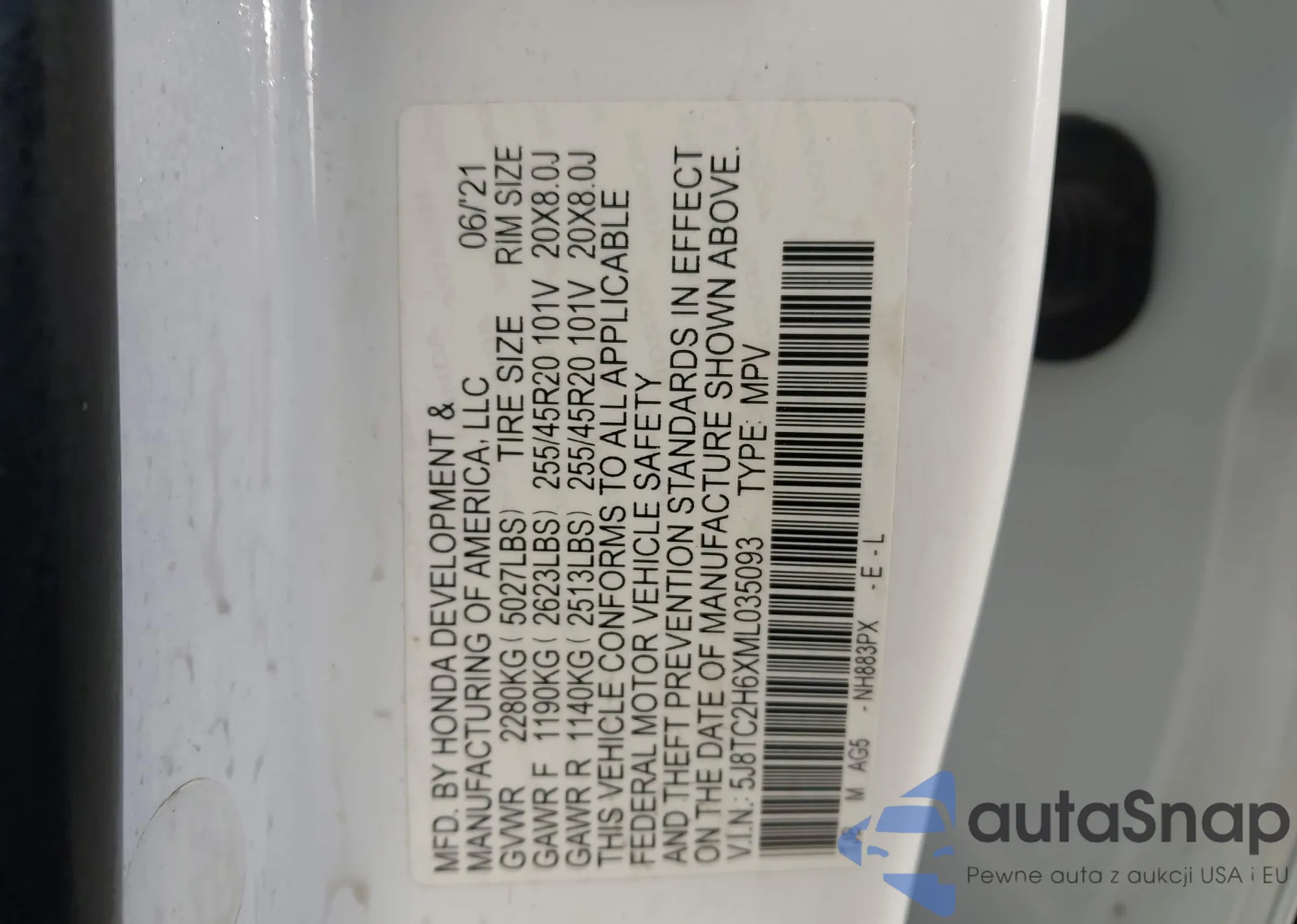 LOT: 44319637 VIN: 5J8TC2H6XML035093