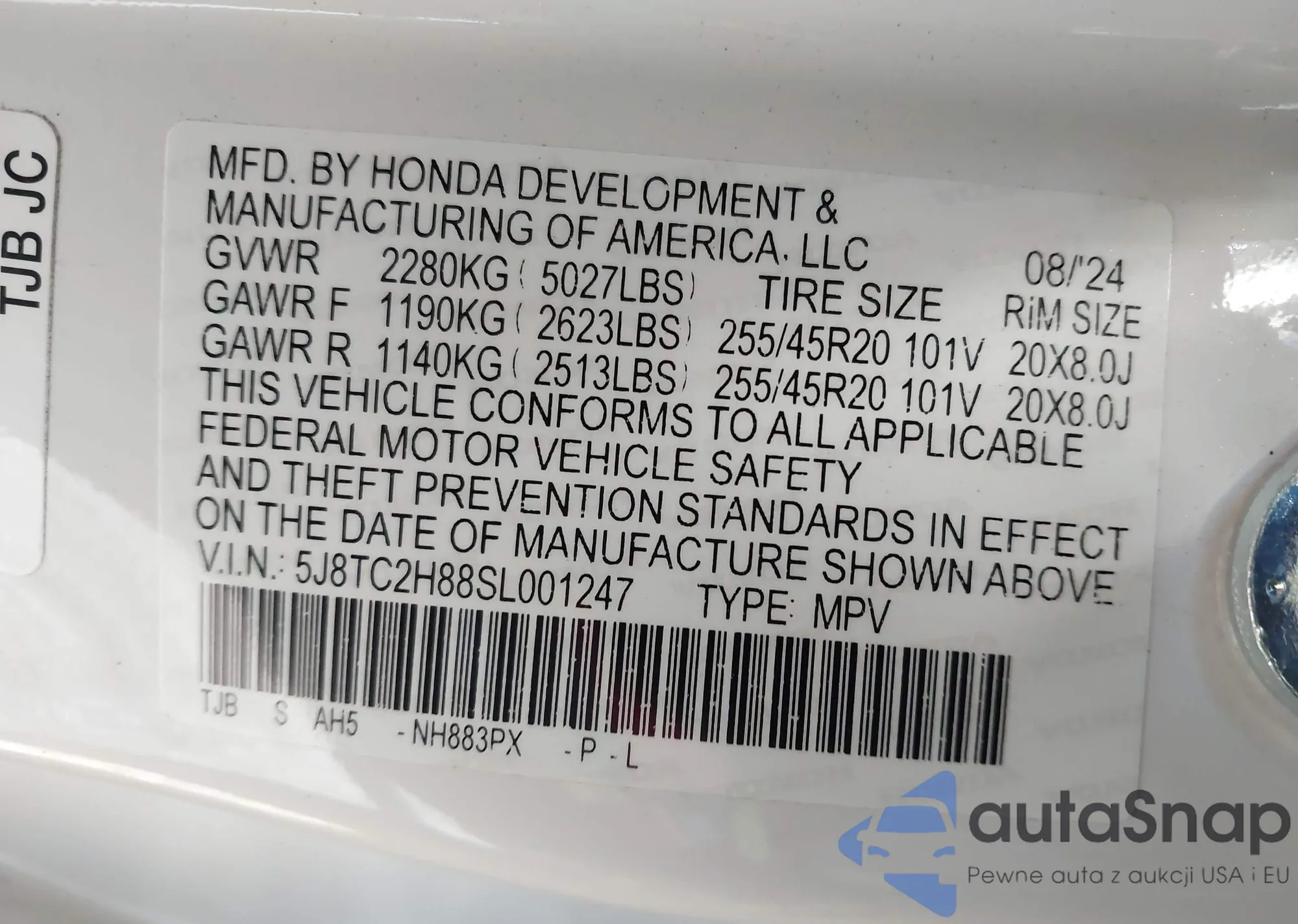 • VIN 5J8TC2H88SL001247
