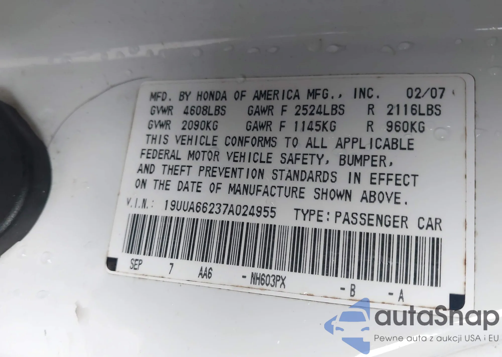 LOT: 44420586 VIN: 19UUA66237A024955