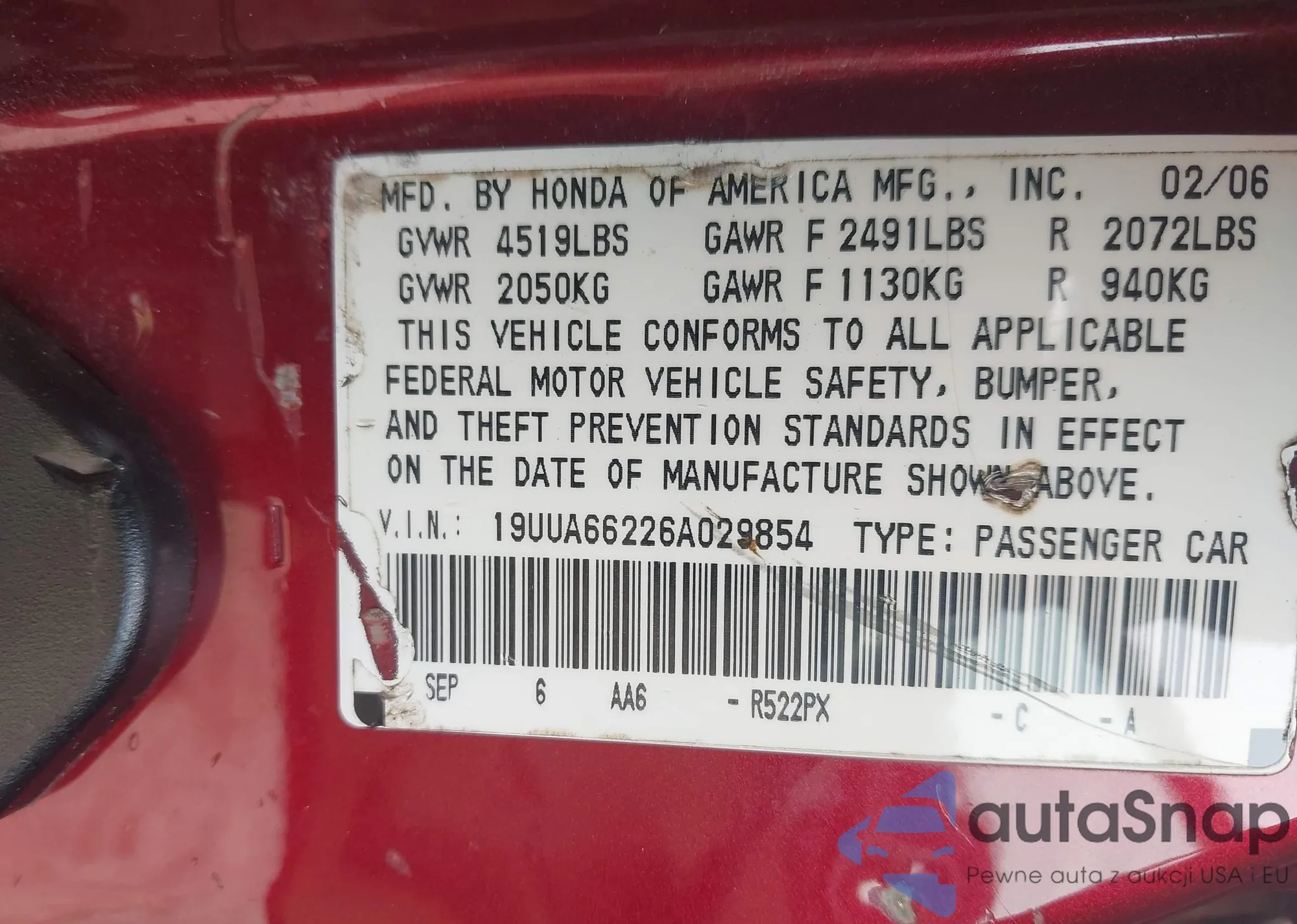 LOT: 44438267 VIN: 19UUA66226A029854